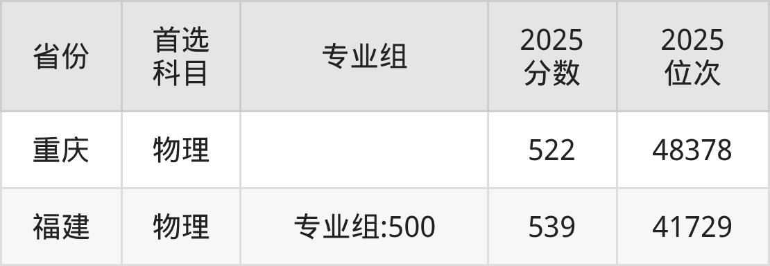 物理类最低分对应地区为重庆,录取位次为48378,超本科线97分;最高分对应地区为福建(专业组:500),录取位次为41729,超本科线98分。