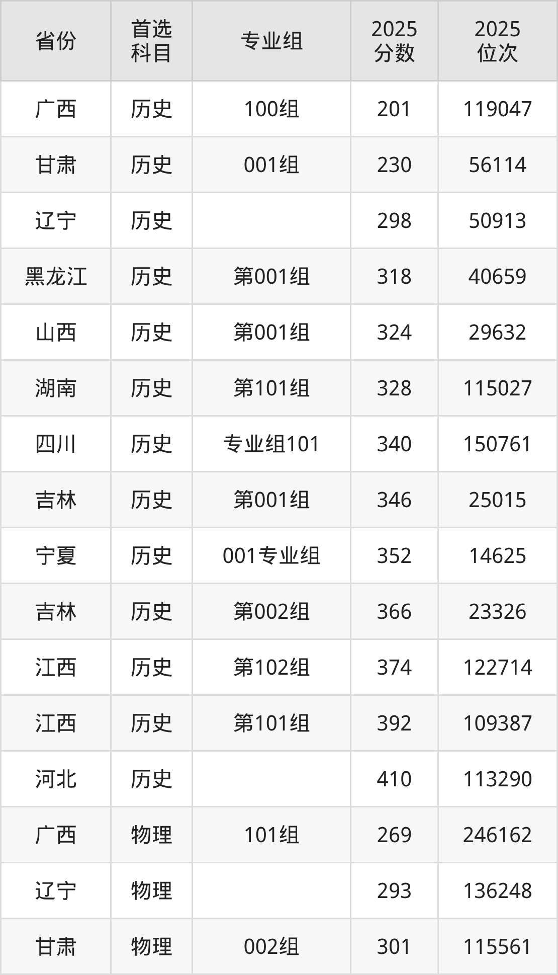 历史类最低分对应地区为广西(100组),录取位次为119047,超专科线1分;最高分对应地区为河北,录取位次为113290。