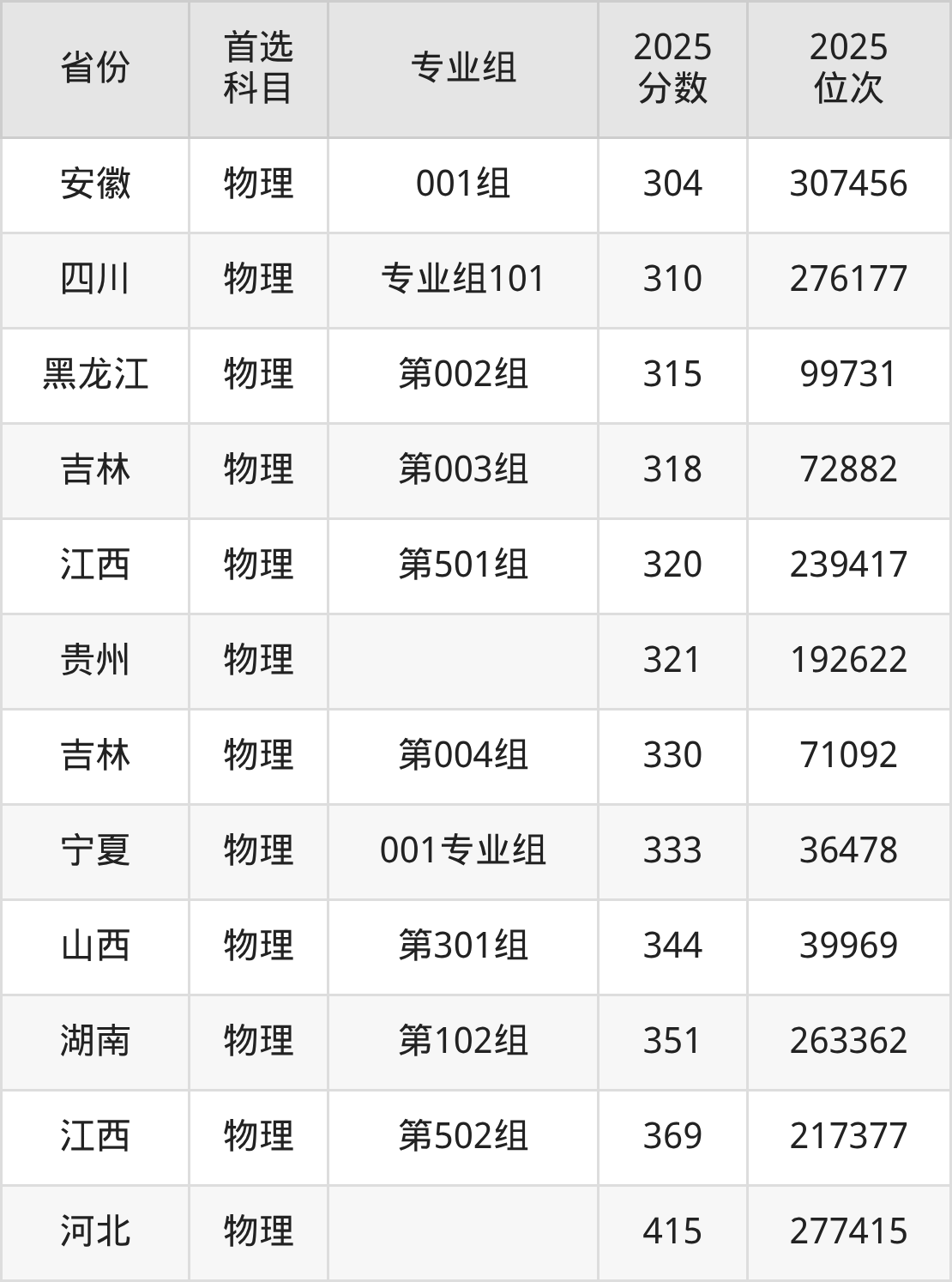 物理类最低分对应地区为广西(101组),录取位次为246162,超专科线69分;最高分对应地区为河北,录取位次为277415,超专科线215分。