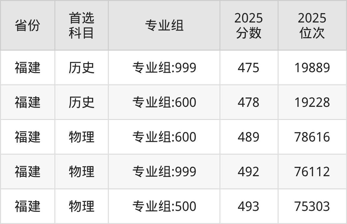 历史类最低分对应地区为福建(专业组:999),录取位次为19889,超本科线25分;最高分对应地区为福建(专业组:600),录取位次为19228,超本科线28分。