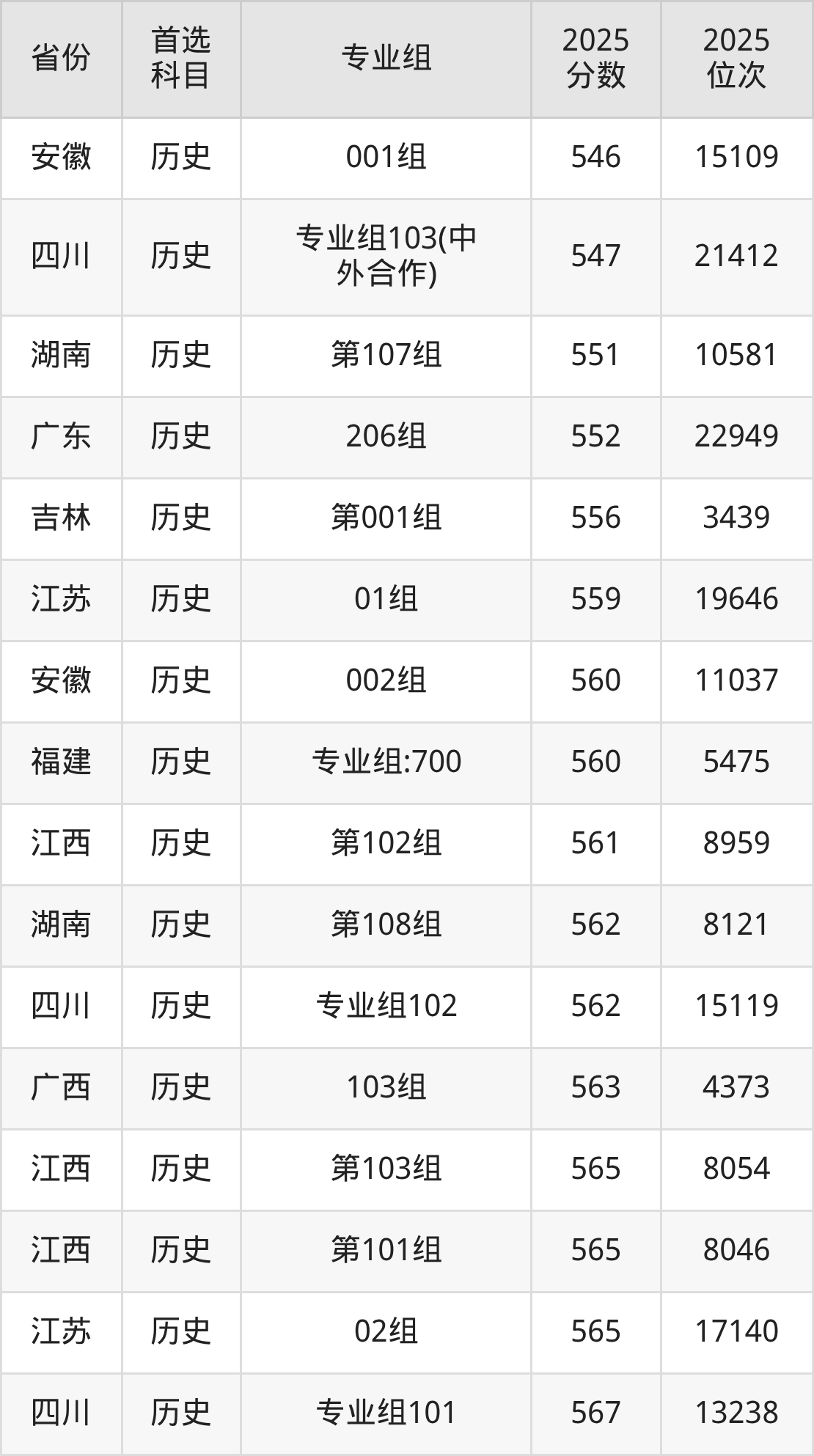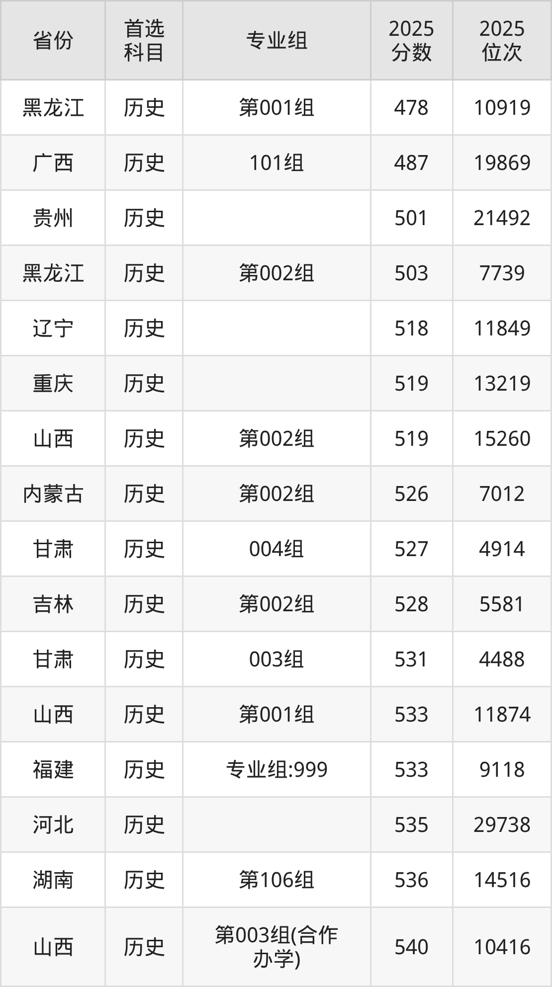 历史类最低分对应地区为黑龙江(第001组),录取位次为10919,超本科线73分;最高分对应地区为四川(专业组104),录取位次为10296,超本科B109分。
