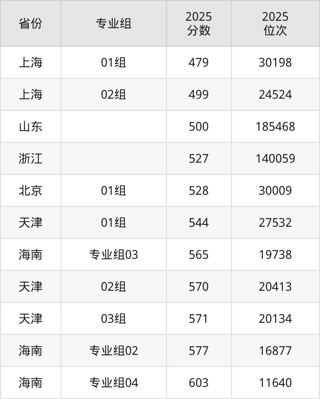 最低分对应地区为上海(01组),录取位次为30198,超本科线77分;最高分对应地区为海南(专业组04),录取位次为11640,超本科线123分。
