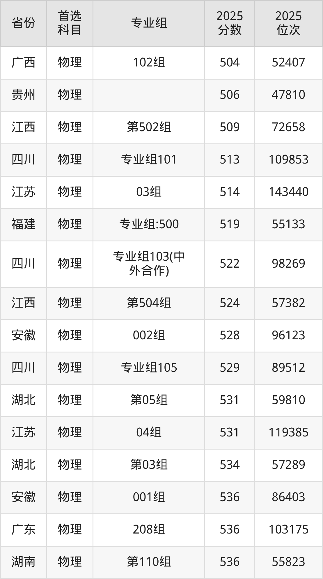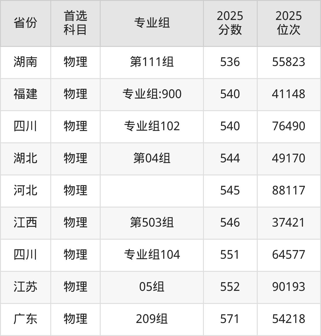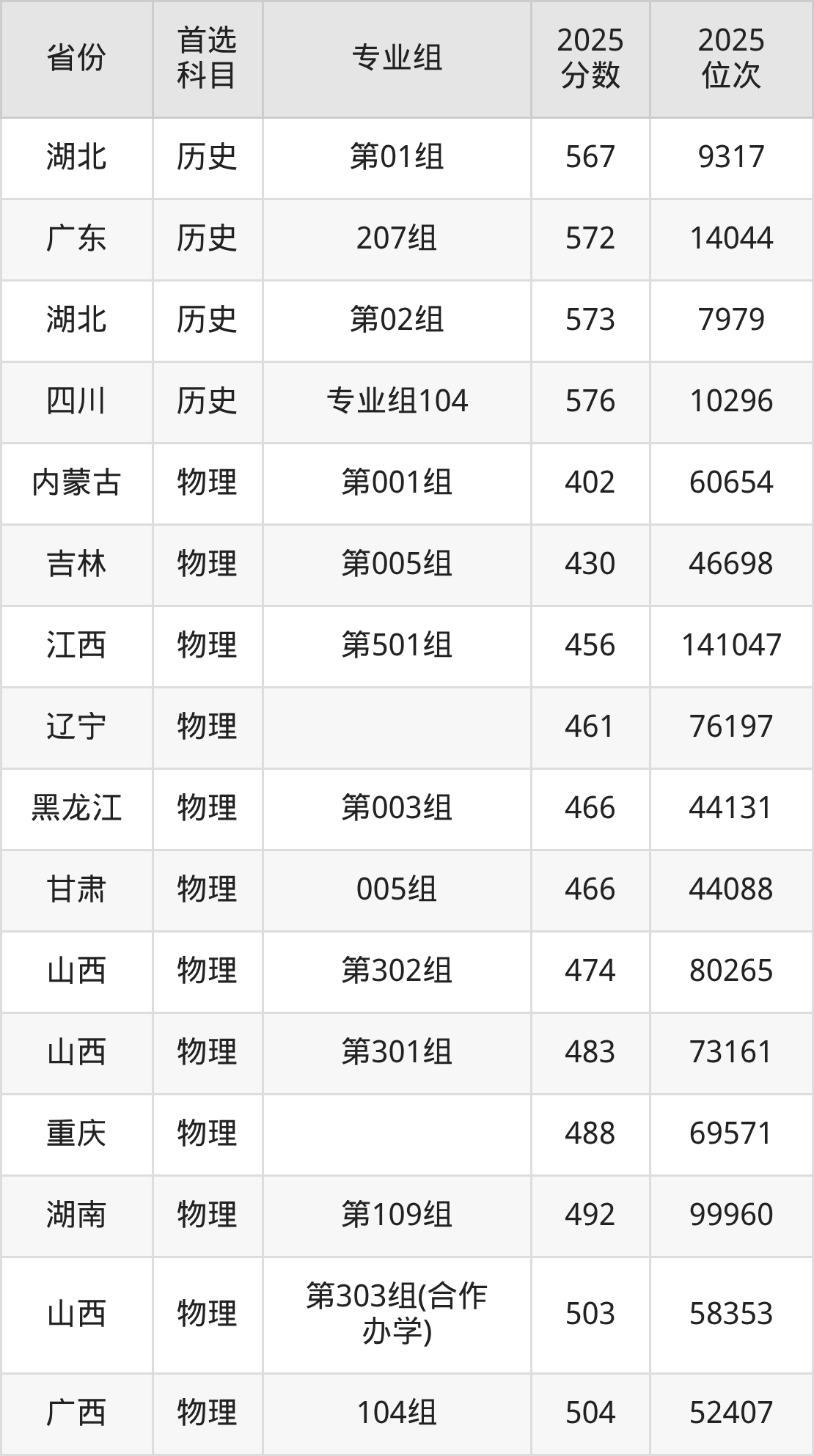 物理类最低分对应地区为内蒙古(第001组),录取位次为60654,超本科线27分;最高分对应地区为广东(209组),录取位次为54218,超本科线135分。
