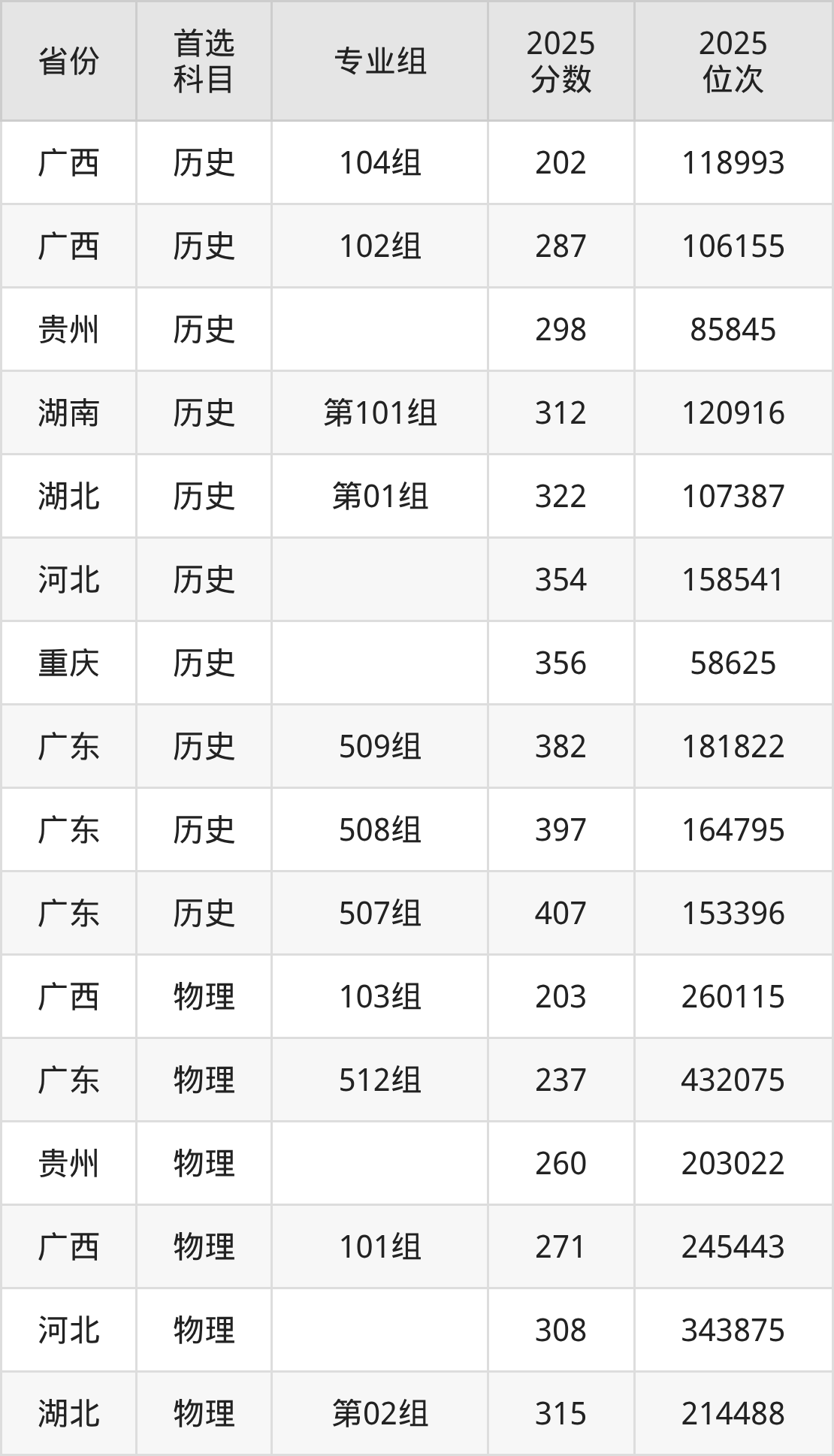 历史类最低分对应地区为广西(104组),录取位次为118993,超专科线2分;最高分对应地区为广东(507组),录取位次为153396,超专科线192分。