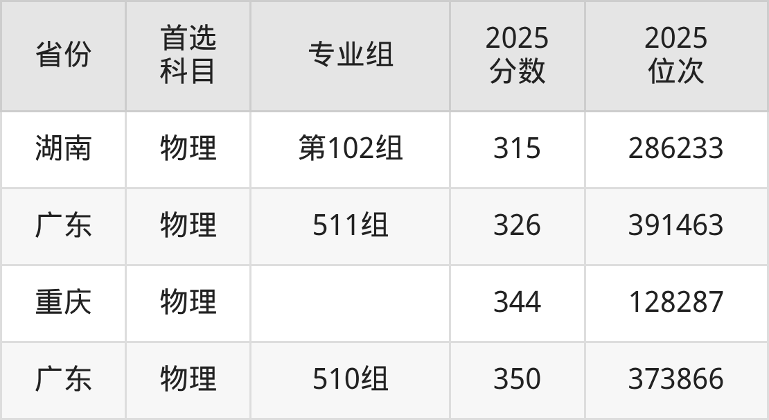 物理类最低分对应地区为广西(103组),录取位次为260115,超专科线3分;最高分对应地区为广东(510组),录取位次为373866。