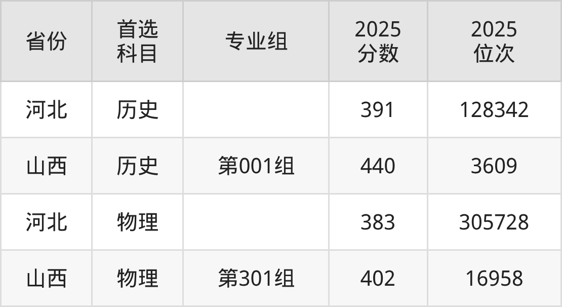 历史类最低分对应地区为河北,录取位次为128342,超专科线191分;最高分对应地区为山西(第001组),录取位次为3609。