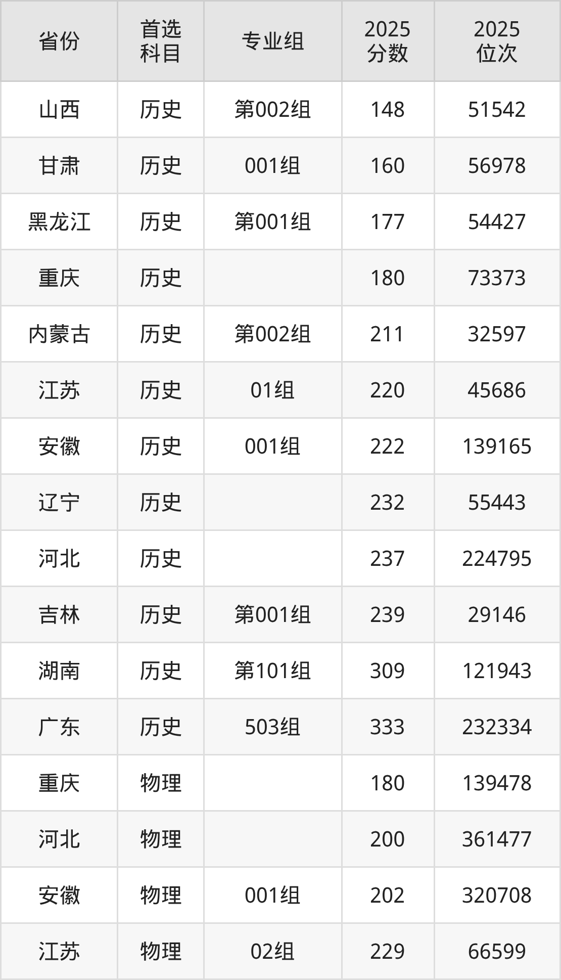 历史类最低分对应地区为山西(第002组),录取位次为51542,超专科线48分;最高分对应地区为广东(503组),录取位次为232334,超专科线118分。