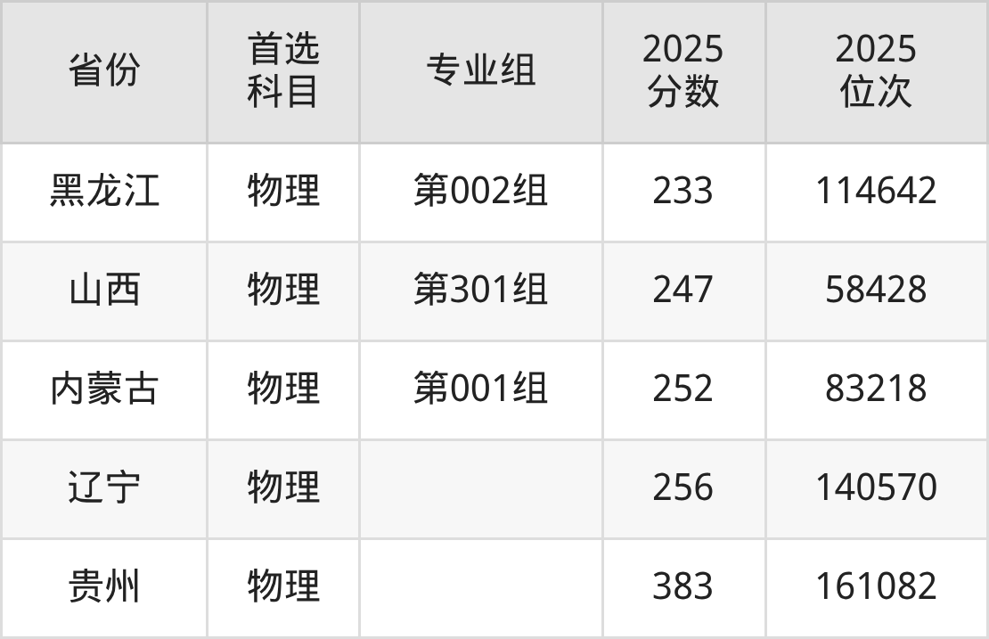 物理类最低分对应地区为重庆,录取位次为139478;最高分对应地区为贵州,录取位次为161082,超专科线203分。