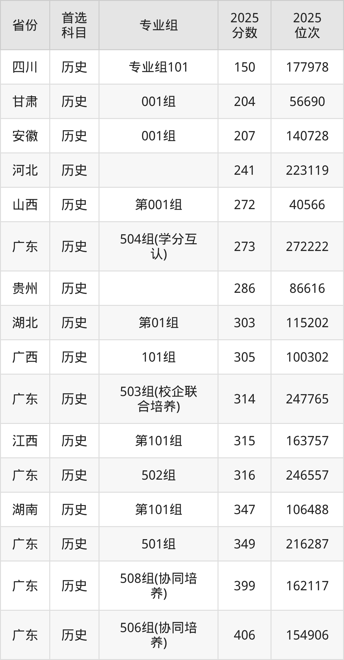 历史类:501组349分、216287名,502组316分、246557名,503组(校企联合培养)314分、247765名,504组(学分互认)273分、272222名,505组(协同培养)406分、154257名,506组(协同培养)406分、154906名,507组(协同培养)416分、142903名,508组(协同培养)399分、162117名;