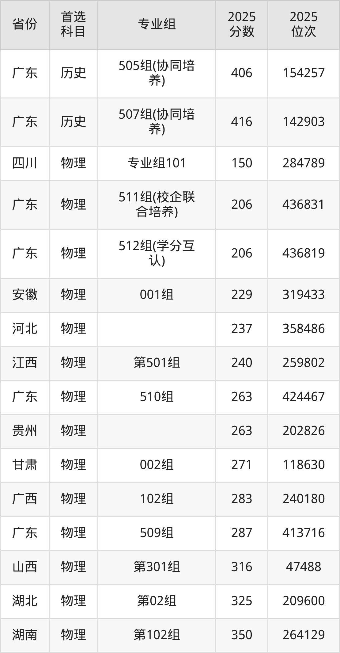 历史类最低分对应地区为四川(专业组101),录取位次为177978;最高分对应地区为广东(507组(协同培养)),录取位次为142903,超专科线201分。
