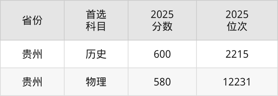 历史类最低分对应地区为贵州,录取位次为2215,超本科线142分。