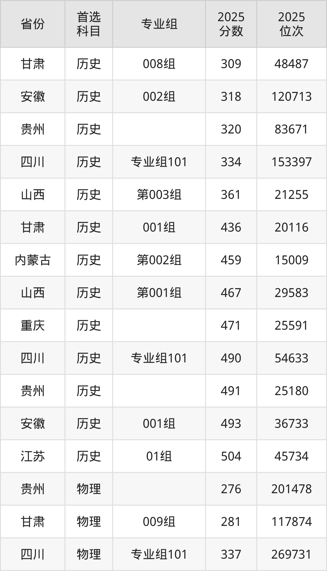 历史类最低分对应地区为甘肃(008组),录取位次为48487,超专科线149分;最高分对应地区为江苏(01组),录取位次为45734,超本科线22分。