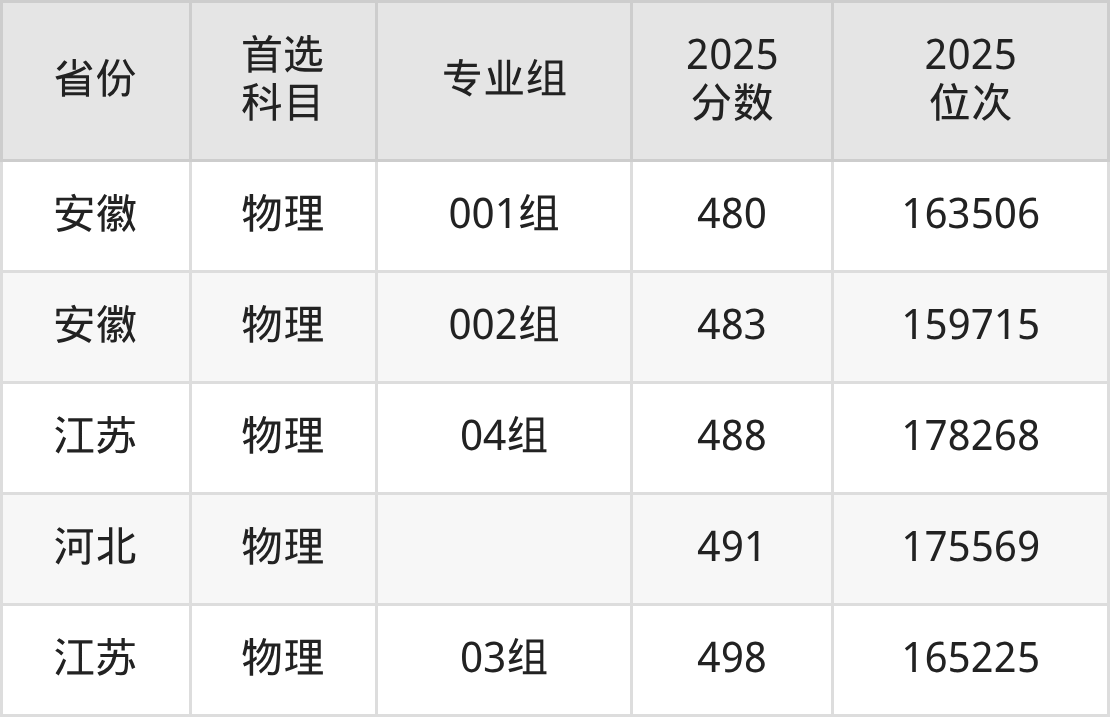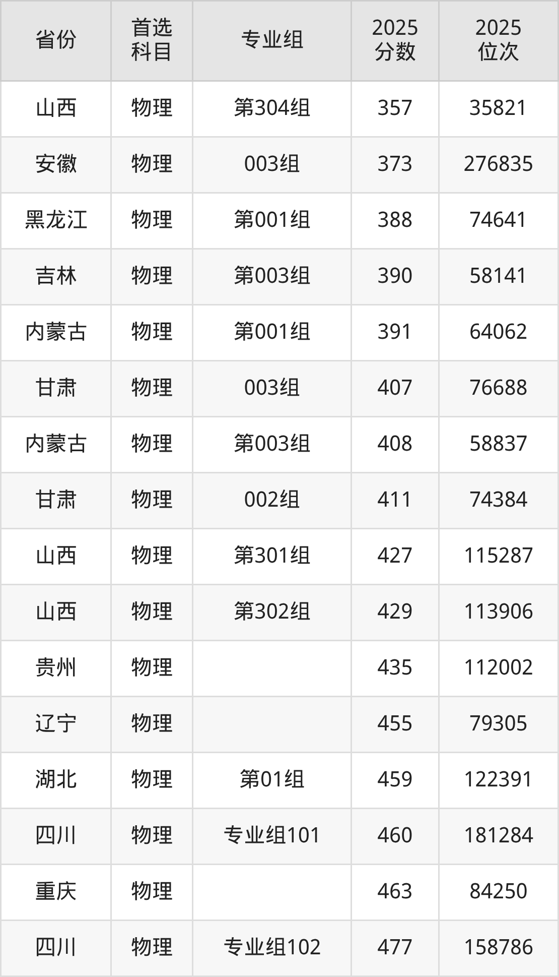 物理类最低分对应地区为贵州,录取位次为201478,超专科线96分;最高分对应地区为江苏(03组),录取位次为165225,超本科线35分。