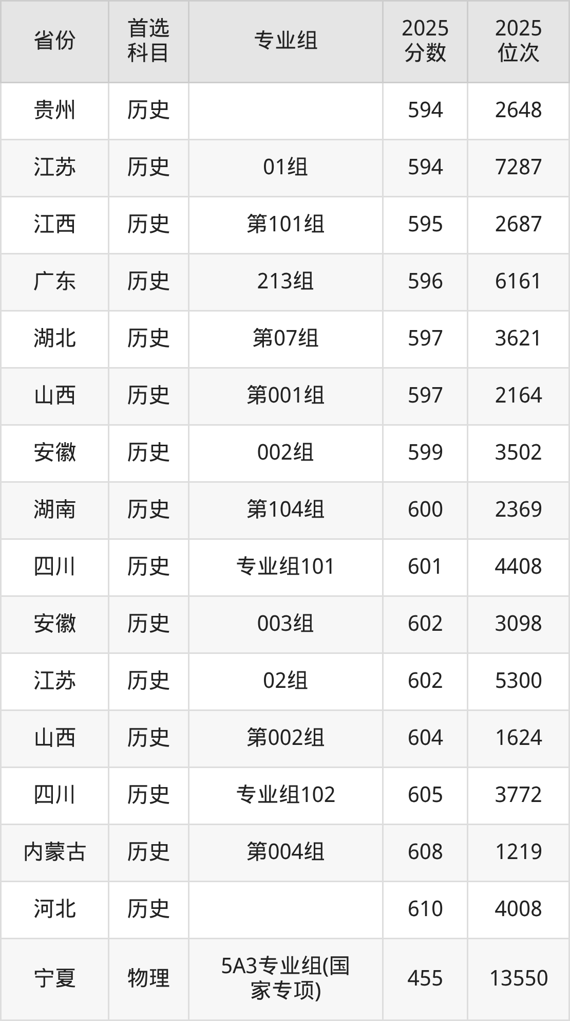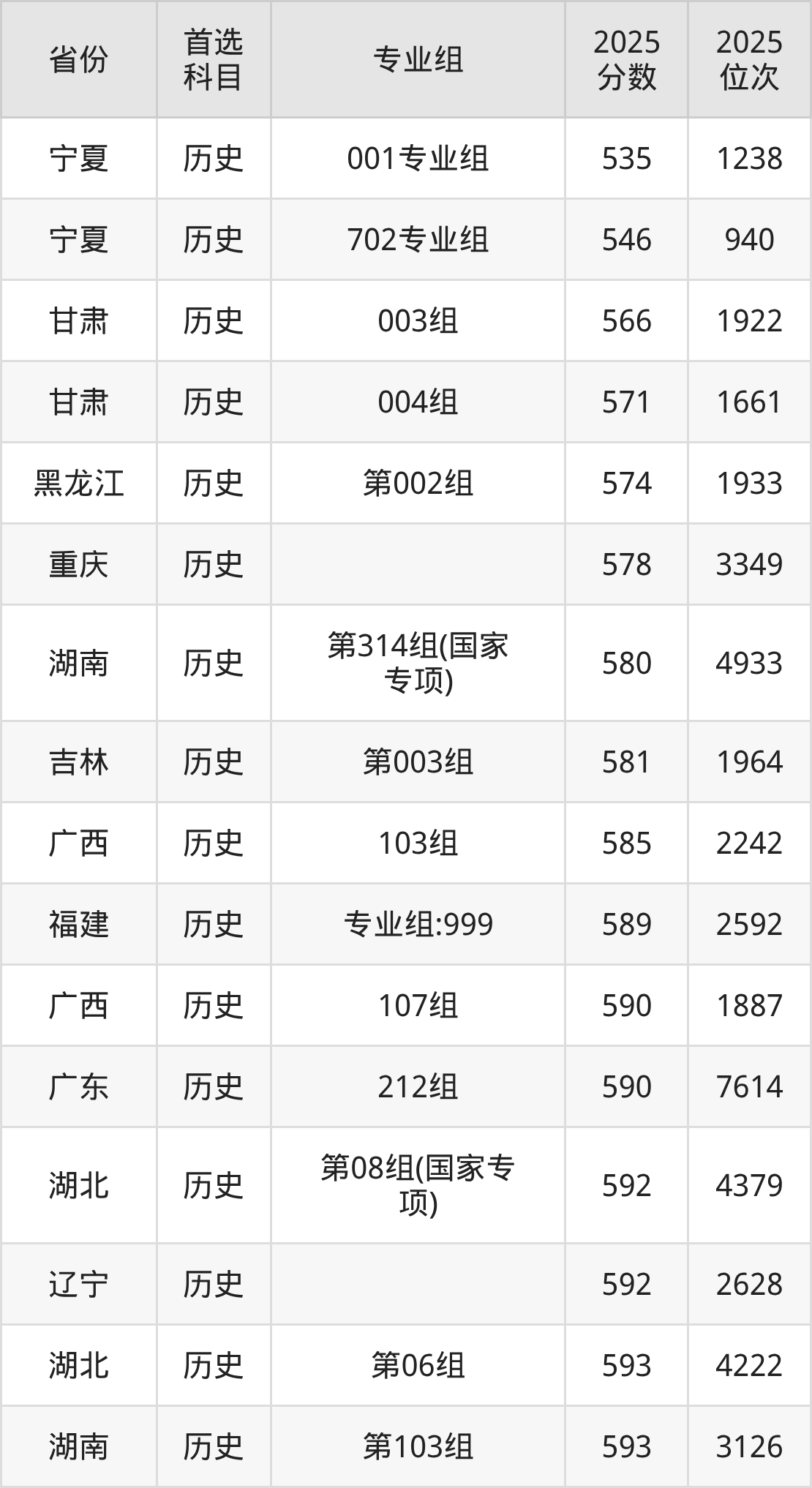 历史类:第06组593分、4222名,第07组597分、3621名,第08组(国家专项)592分、4379名;