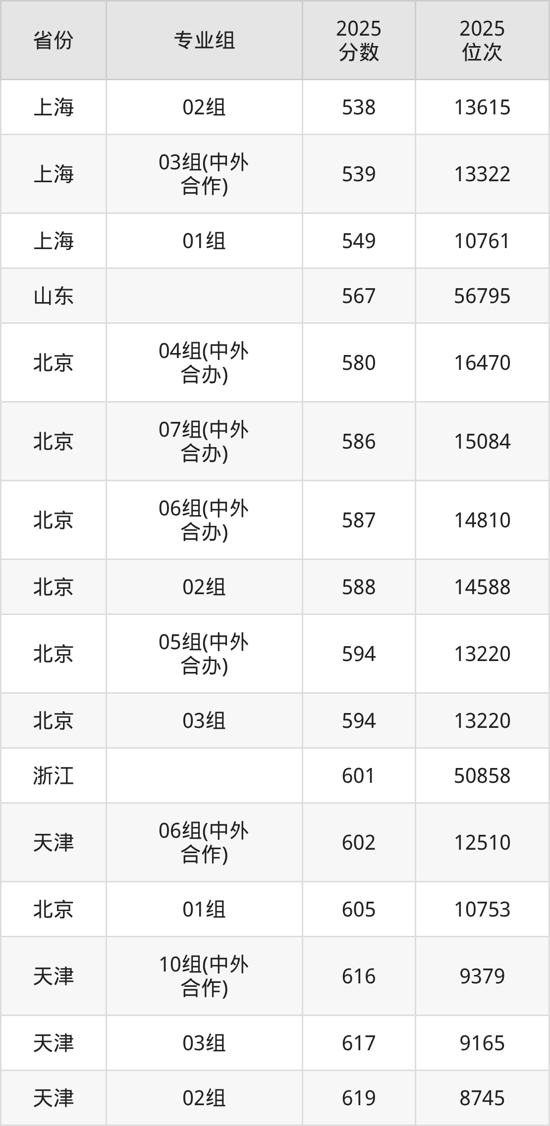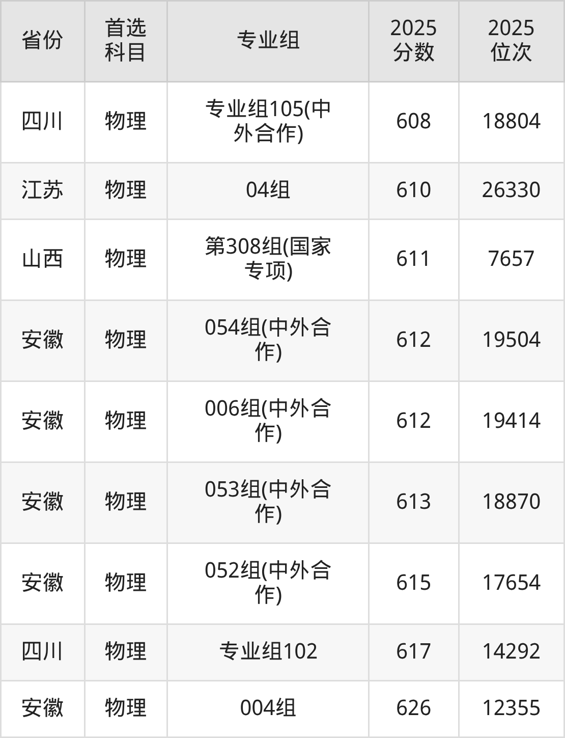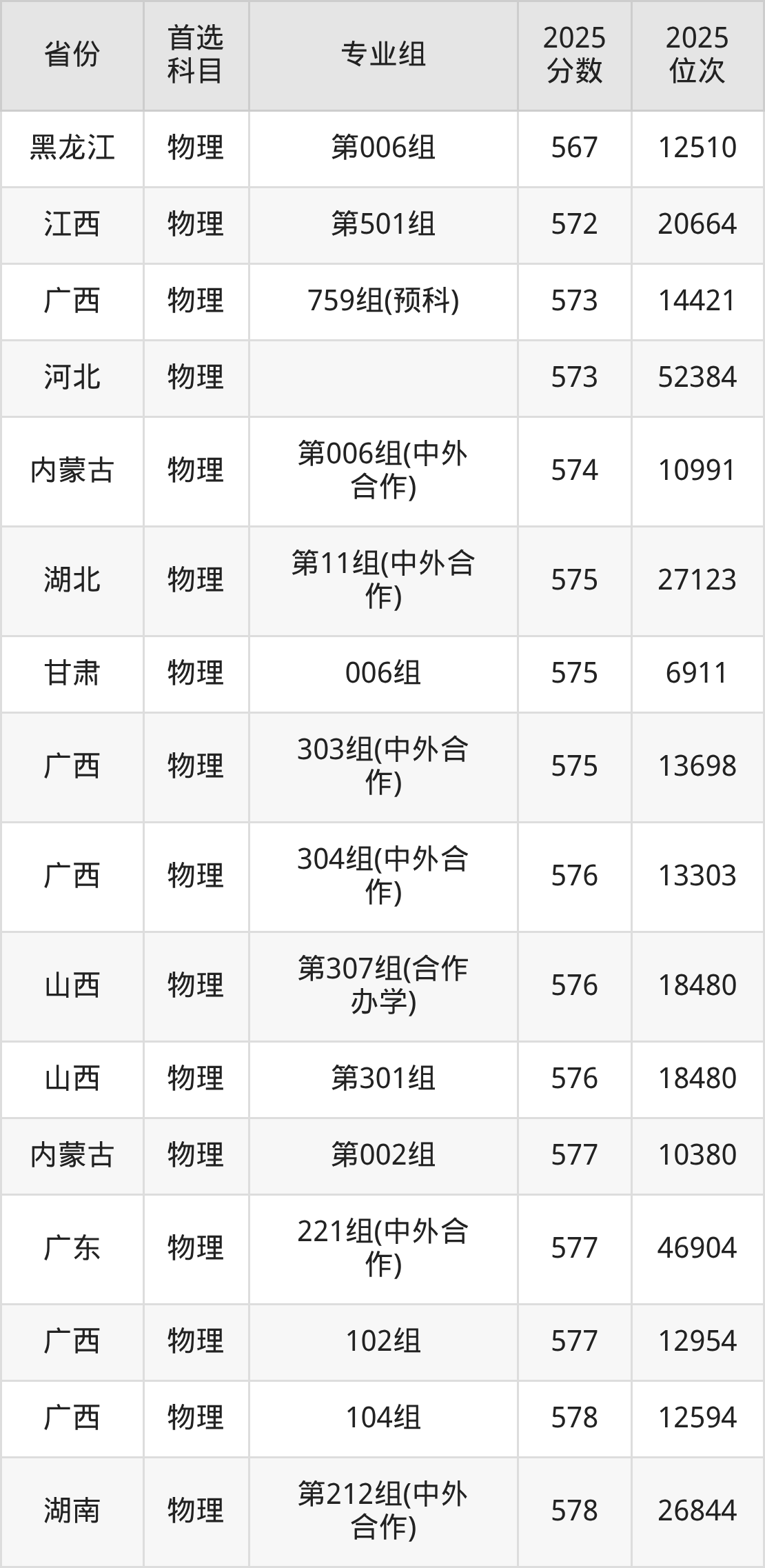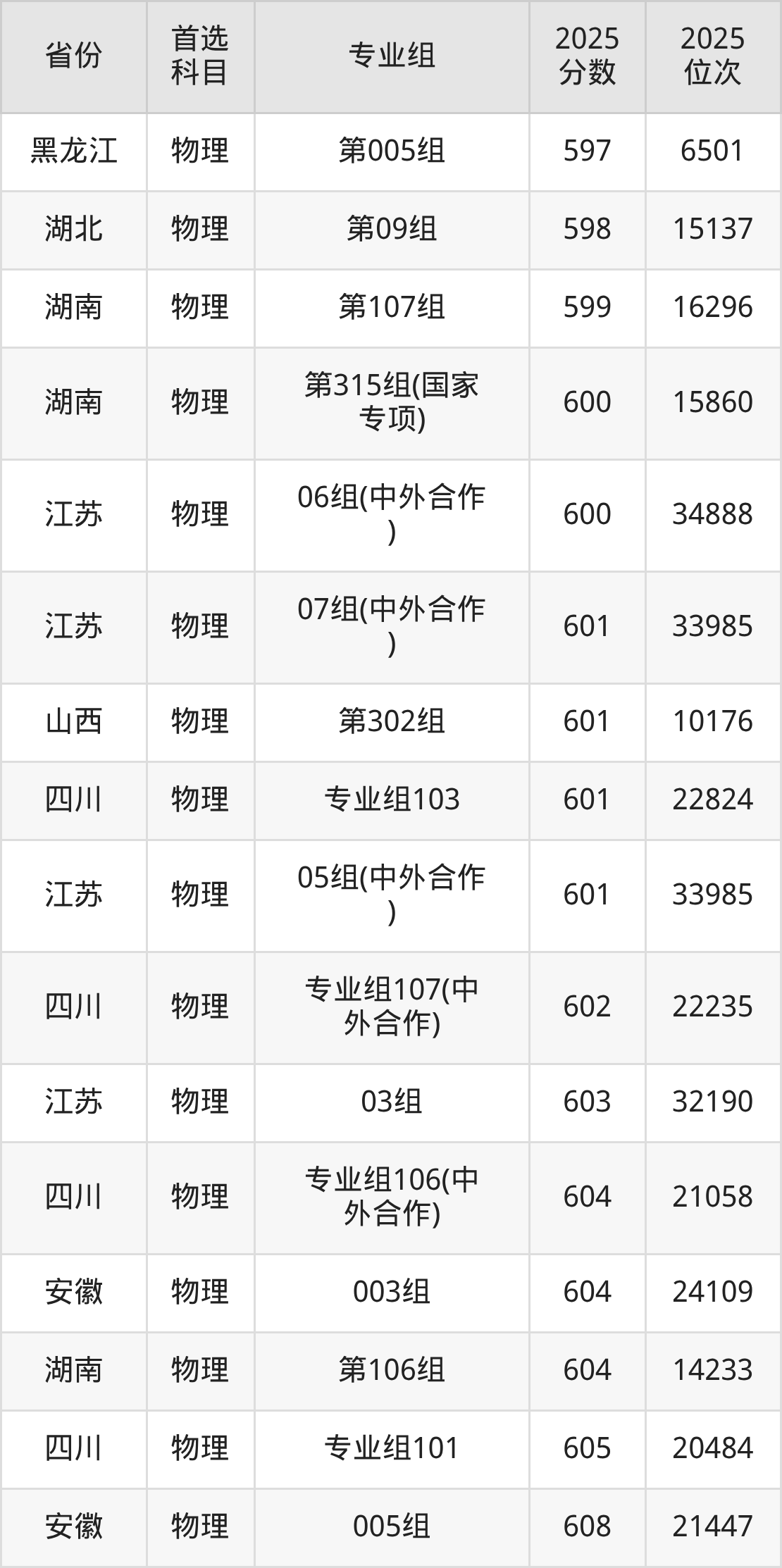 物理类:第03组600分、17613名,第04组(国家专项)592分、21511名,第05组(预科班)594分、20493名,第06组607分、14519名,第07组604分、15768名,第08组(中外合作)591分、21997名,第09组(中外合作)603分、16230名,第10组(国家专项)596分、19537名;