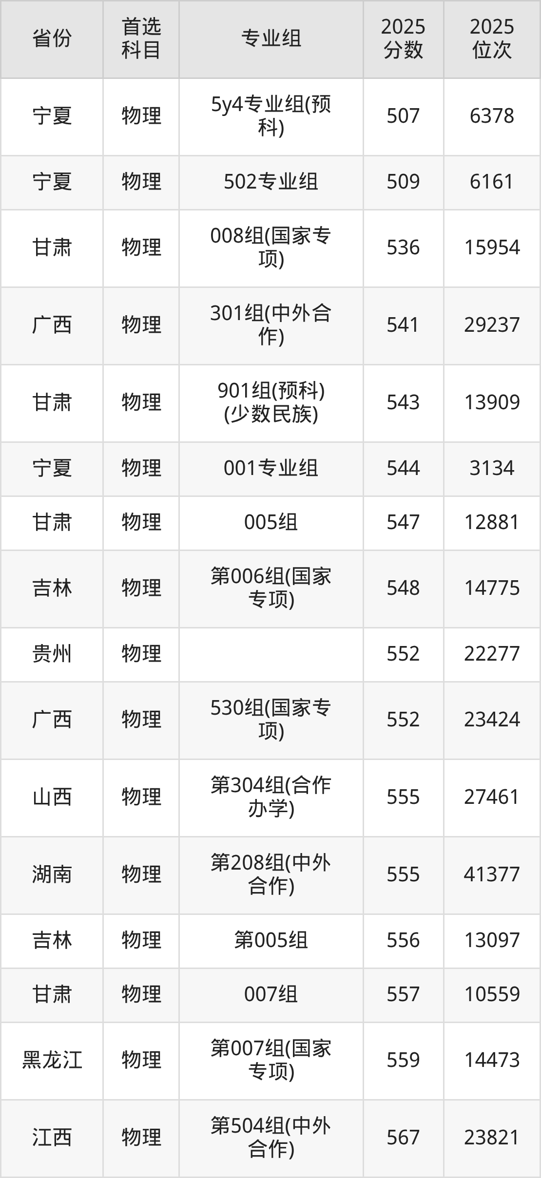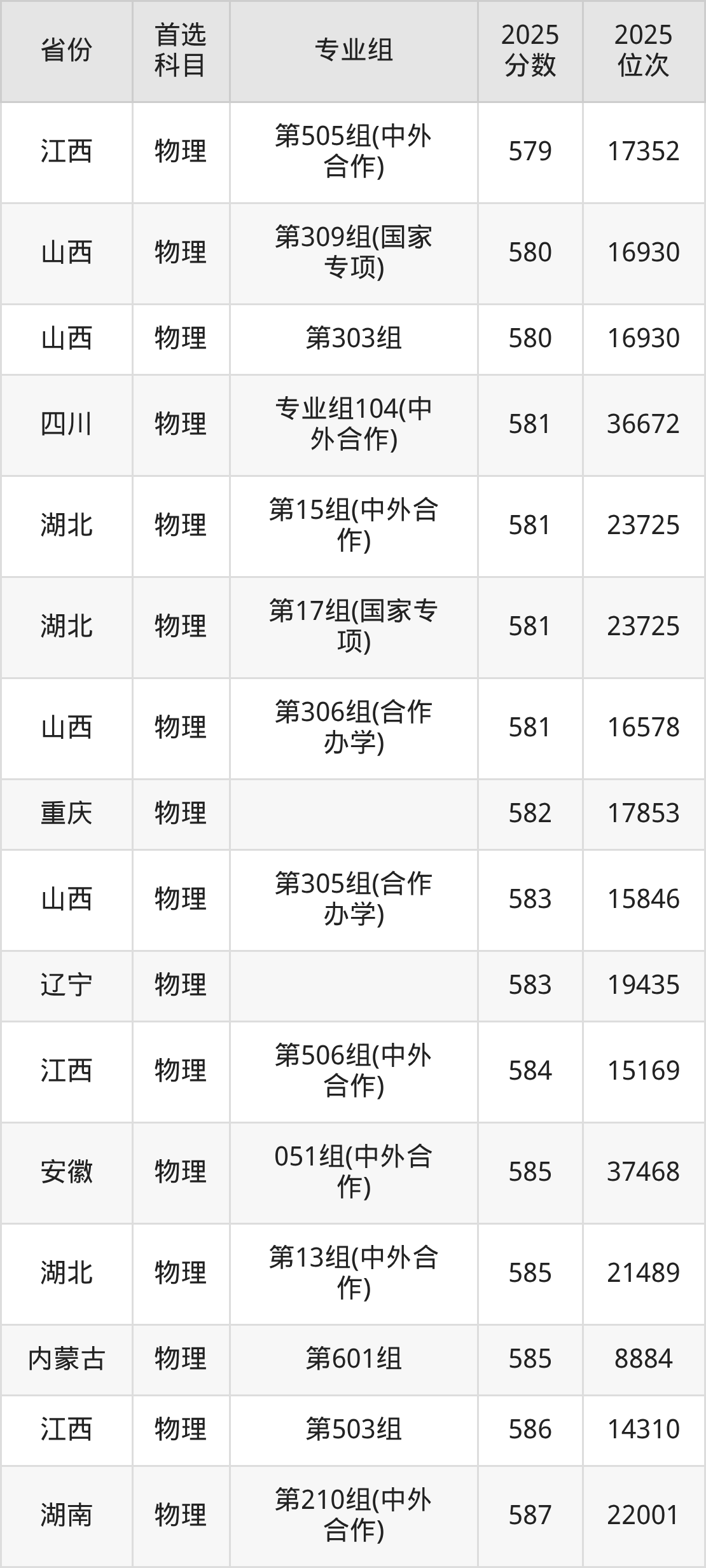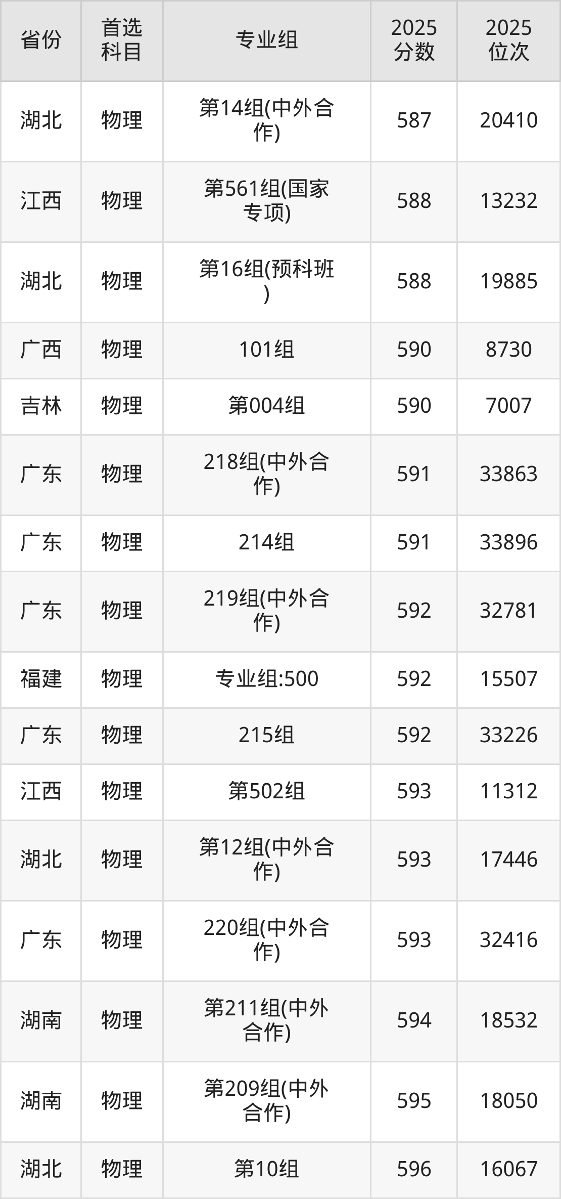 物理类:第09组598分、15137名,第10组596分、16067名,第11组(中外合作)575分、27123名,第12组(中外合作)593分、17446名,第13组(中外合作)585分、21489名,第14组(中外合作)587分、20410名,第15组(中外合作)581分、23725名,第16组(预科班)588分、19885名,第17组(国家专项)581分、23725名;