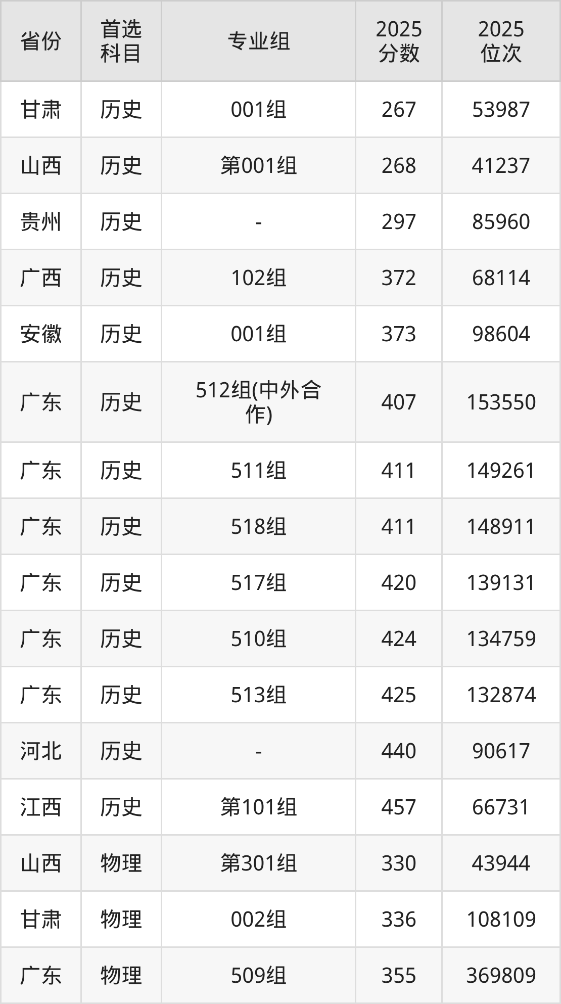 历史类最低分对应地区为甘肃(001组),录取位次为53987,超专科线107分;最高分对应地区为江西(第101组),录取位次为66731,超专科线167分。
