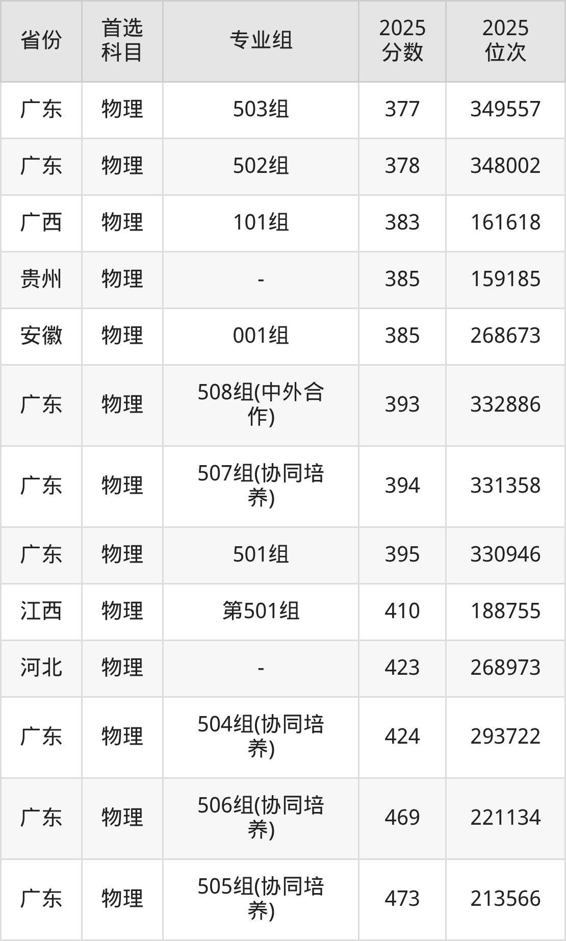 物理类:501组395分、330946名,502组378分、348002名,503组377分、349557名,504组(协同培养)424分、293722名,505组(协同培养)473分、213566名,506组(协同培养)469分、221134名,507组(协同培养)394分、331358名,508组(中外合作)393分、332886名,509组355分、369809名;