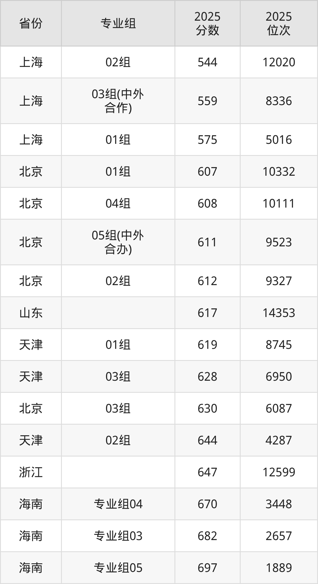 物理类:03组653分、4114名,04组649分、5239名,05组644分、6899名,06组(中外合作)606分、27545名,07组632分、12050名,08组(中外合作)601分、31135名。
