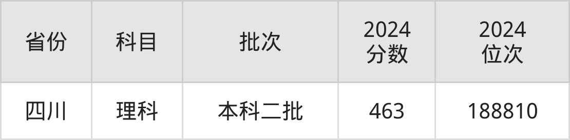 理科最低分对应地区为四川,录取位次为188810,超二本线4分。
