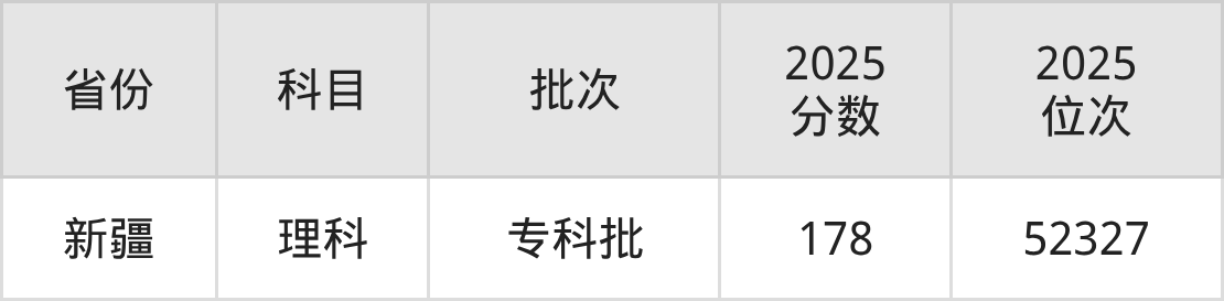 理科最低分对应地区为新疆,录取位次为52327,超专科线38分。