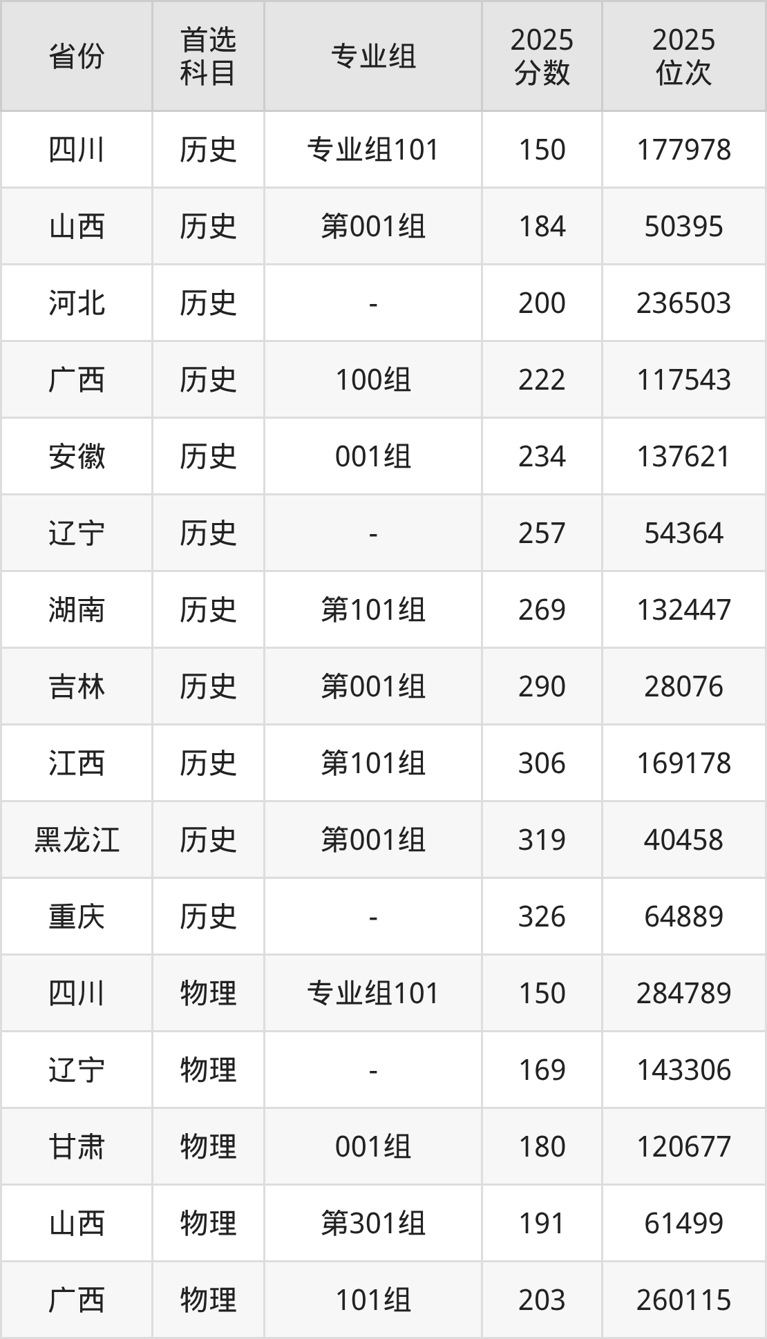 历史类最低分对应地区为四川(专业组101),录取位次为177978;最高分对应地区为重庆,录取位次为64889,超专科线146分。