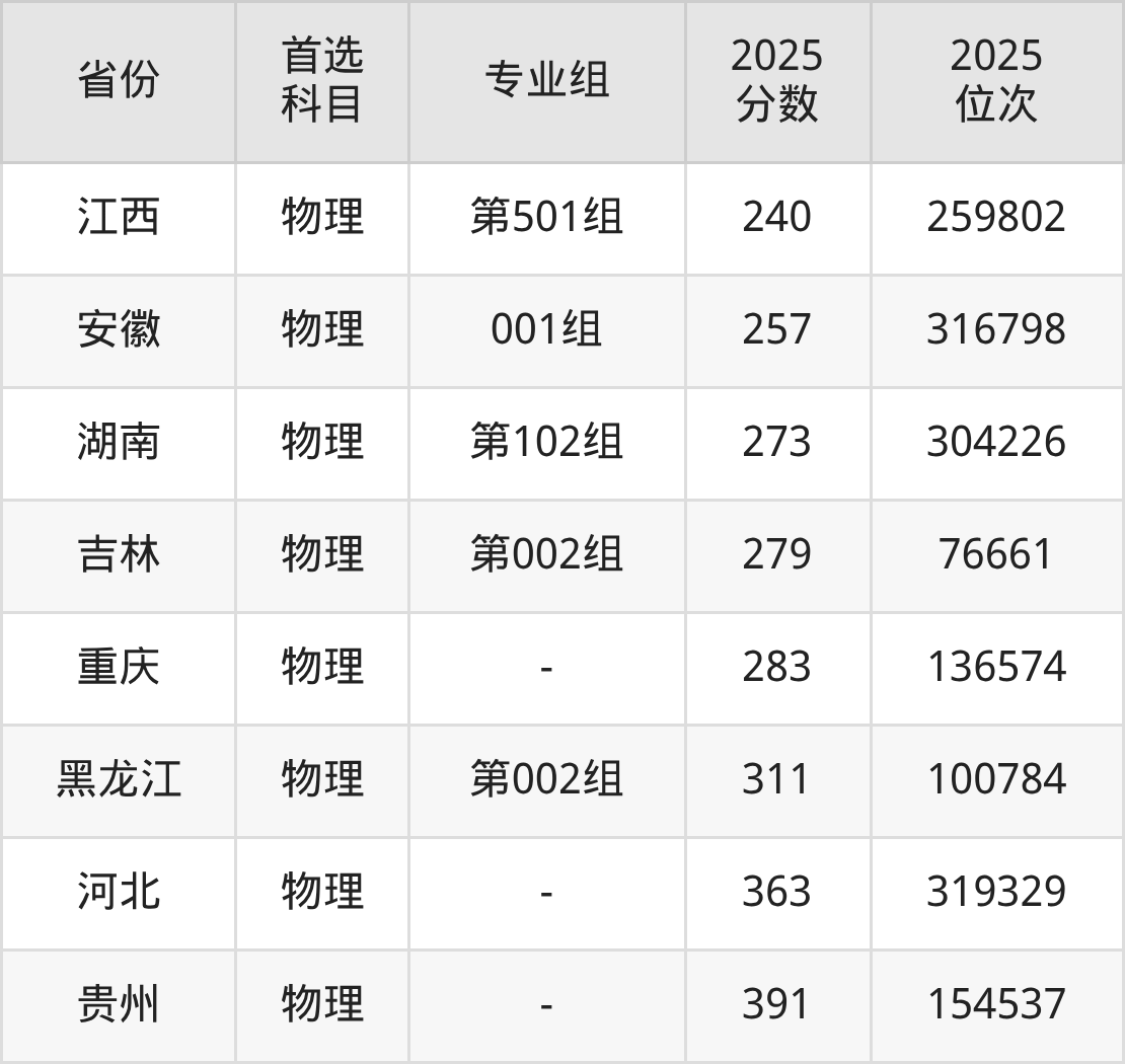 物理类最低分对应地区为四川(专业组101),录取位次为284789;最高分对应地区为贵州,录取位次为154537,超专科线211分。
