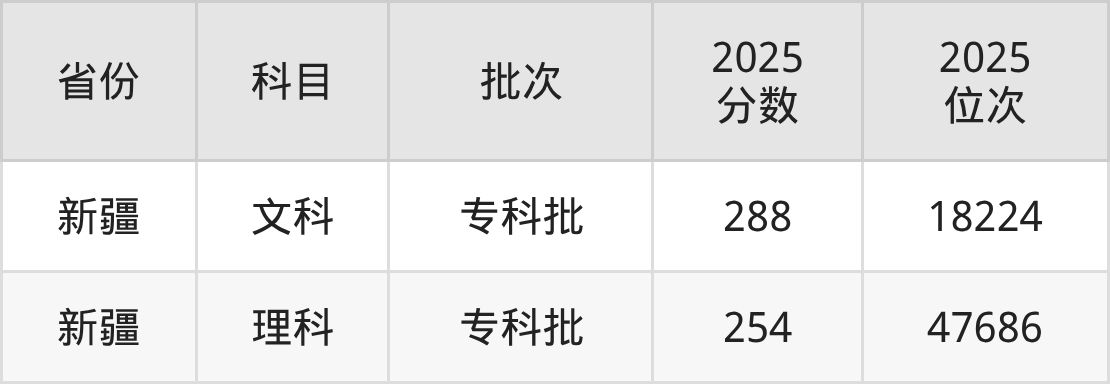 文科最低分对应地区为新疆,录取位次为18224,超专科线148分。