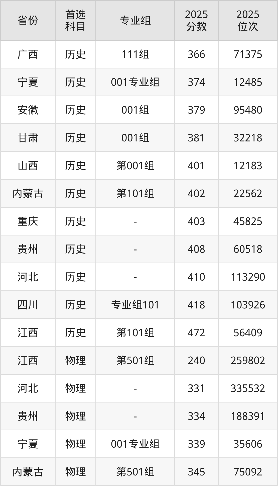 历史类最低分对应地区为广西(111组),录取位次为71375,超专科线166分;最高分对应地区为江西(第101组),录取位次为56409,超专科线182分。