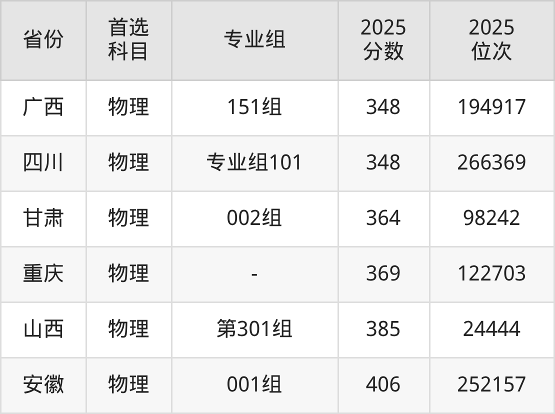 物理类最低分对应地区为江西(第501组),录取位次为259802;最高分对应地区为安徽(001组),录取位次为252157,超专科线206分。