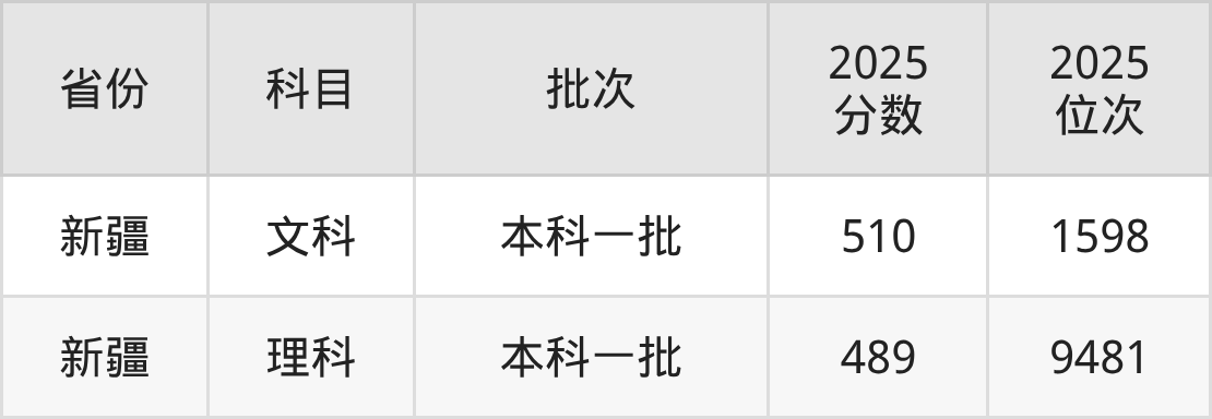 文科最低分对应地区为新疆,录取位次为1598,超一本线59分。