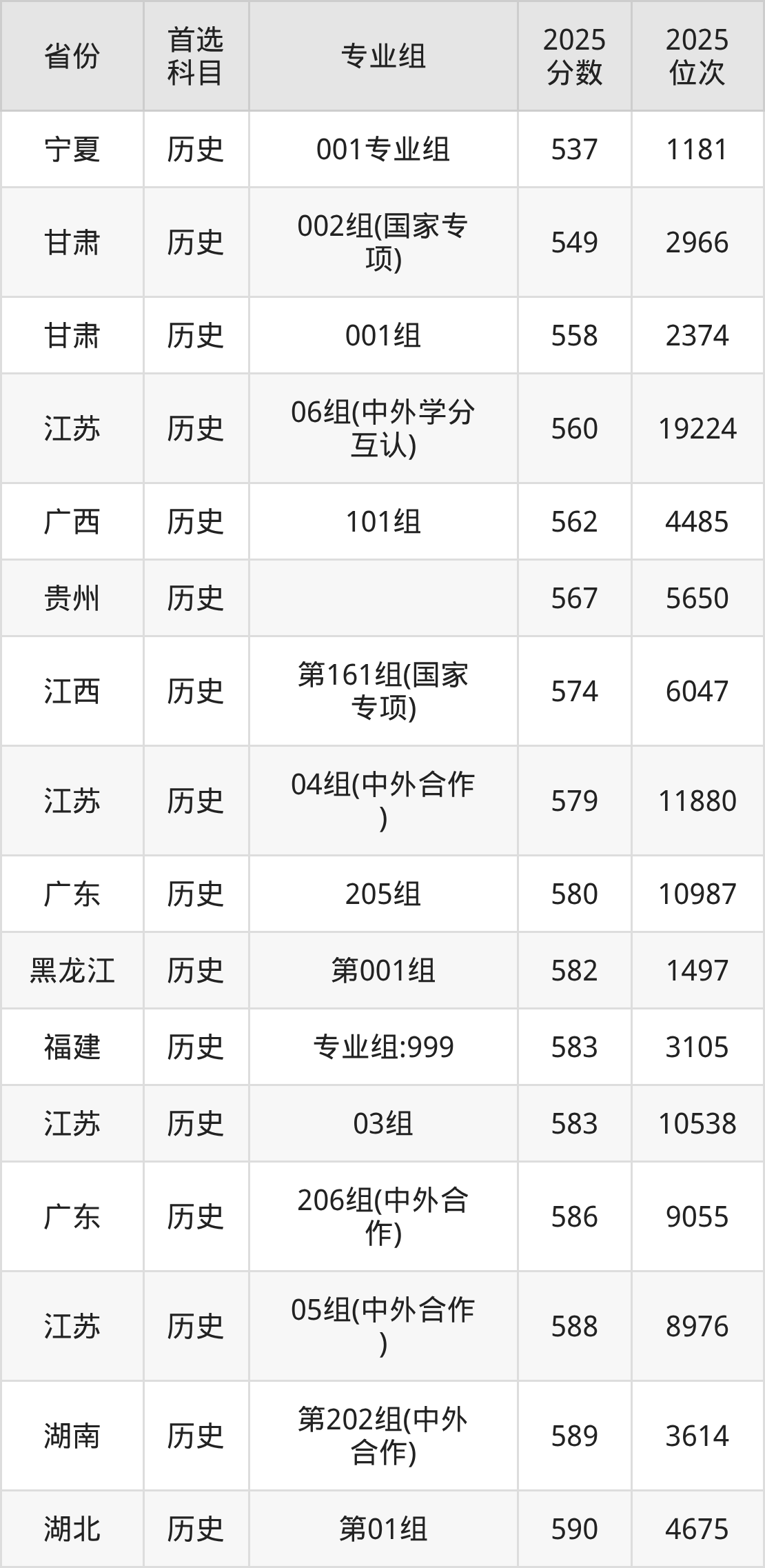 历史类:01组566分、12261名,02组(中外合作)566分、12261名,03组(中外合作)578分、8656名,04组(高校中外联合培养)558分、14930名;