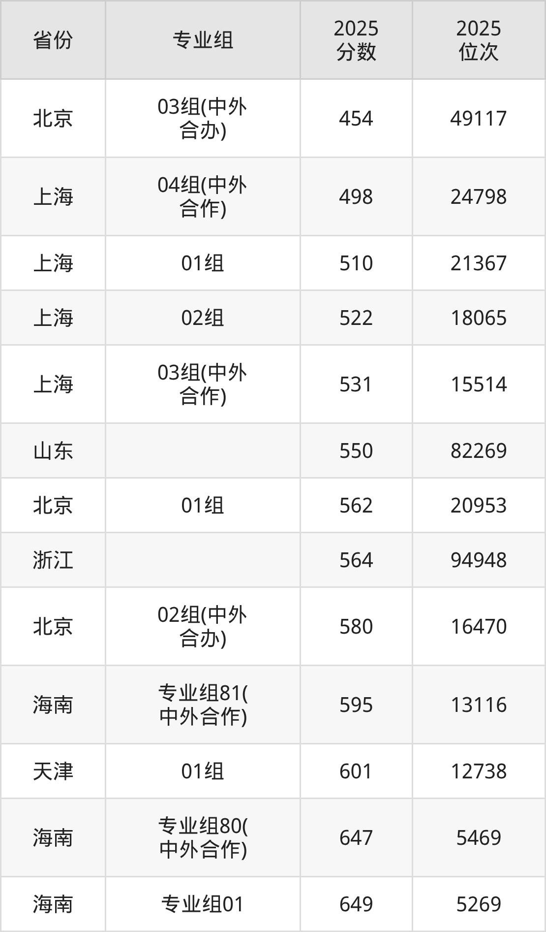 最低分对应地区为北京(03组(中外合办)),录取位次为49117,超本科线24分;最高分对应地区为海南(专业组01),录取位次为5269,超本科线169分。