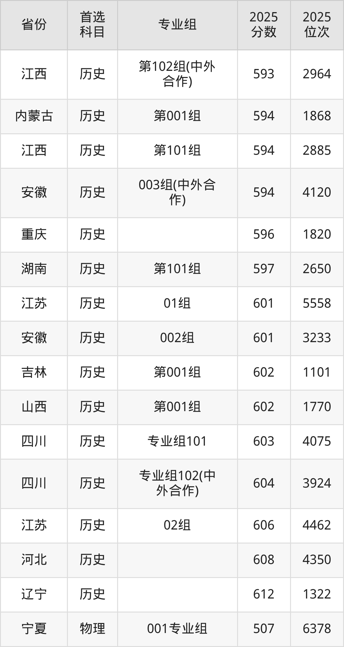 历史类:01组601分、5558名,02组606分、4462名,03组583分、10538名,04组(中外合作)579分、11880名,05组(中外合作)588分、8976名,06组(中外学分互认)560分、19224名;