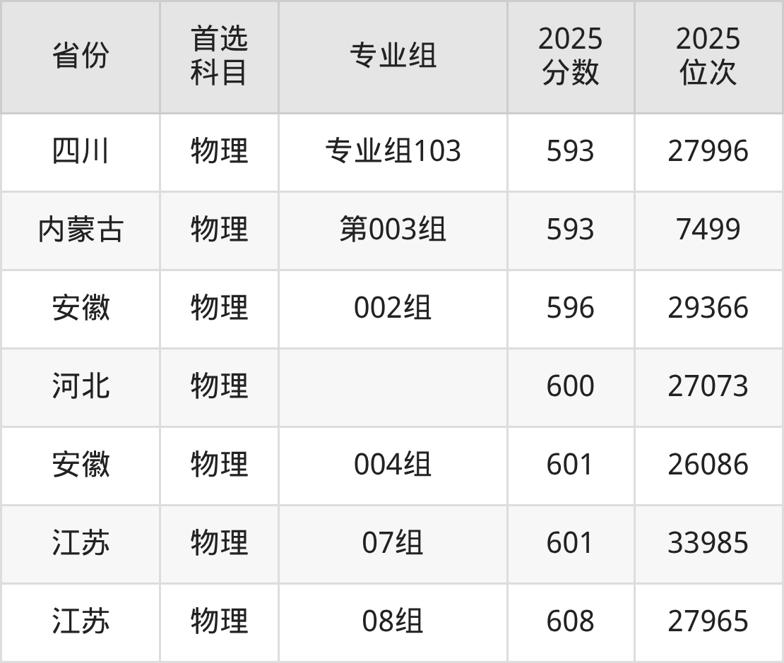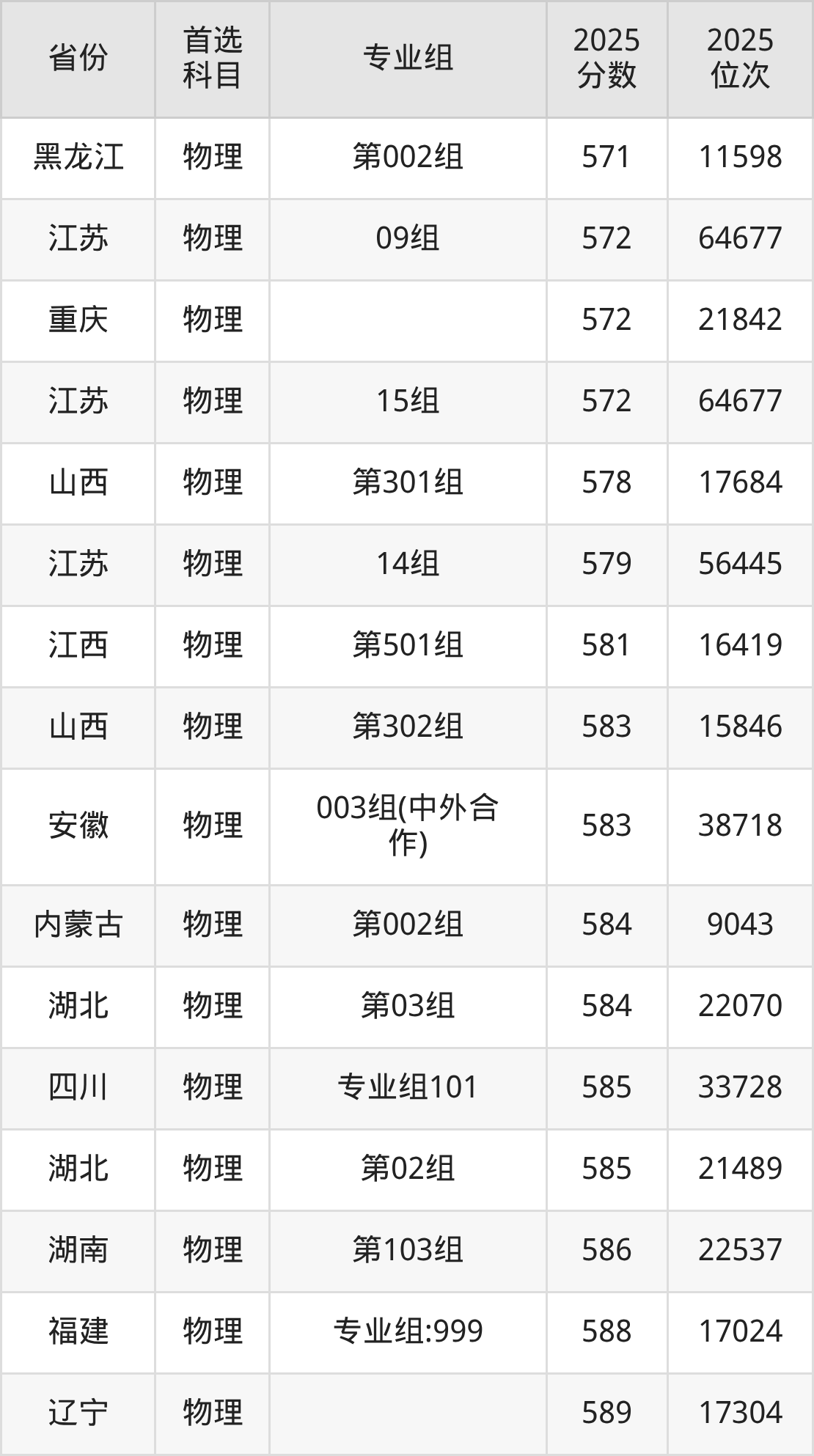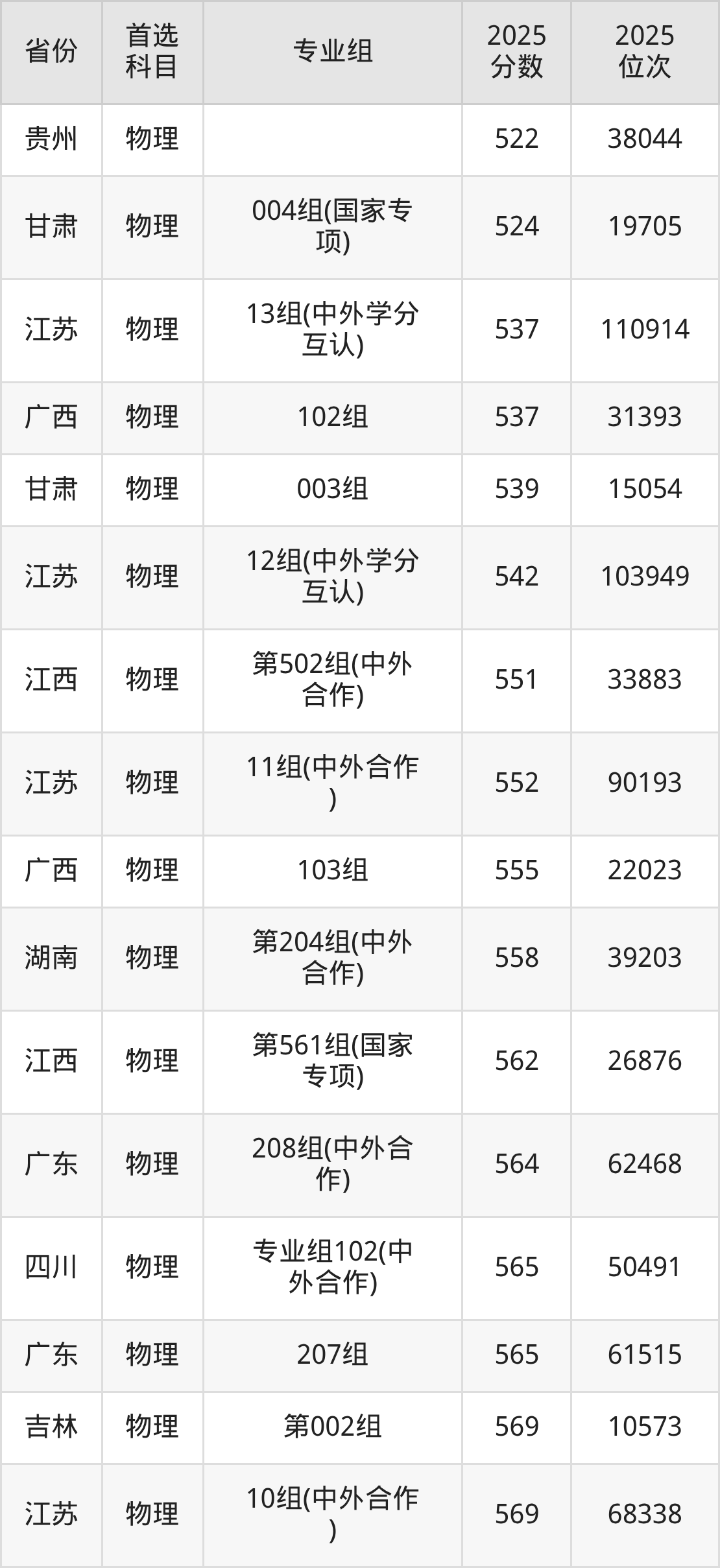 物理类:07组601分、33985名,08组608分、27965名,09组572分、64677名,10组(中外合作)569分、68338名,11组(中外合作)552分、90193名,12组(中外学分互认)542分、103949名,13组(中外学分互认)537分、110914名,14组579分、56445名,15组572分、64677名;