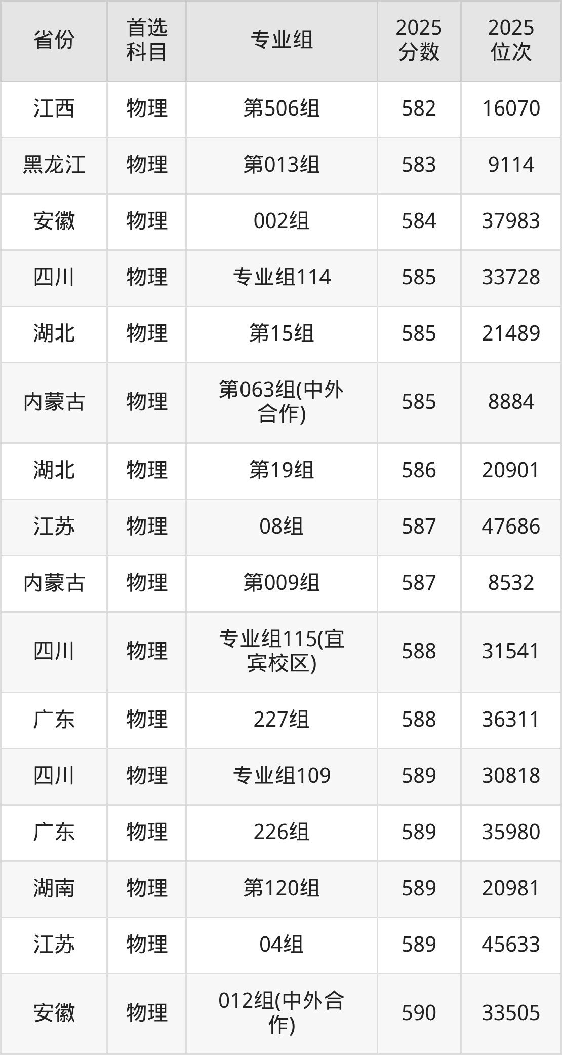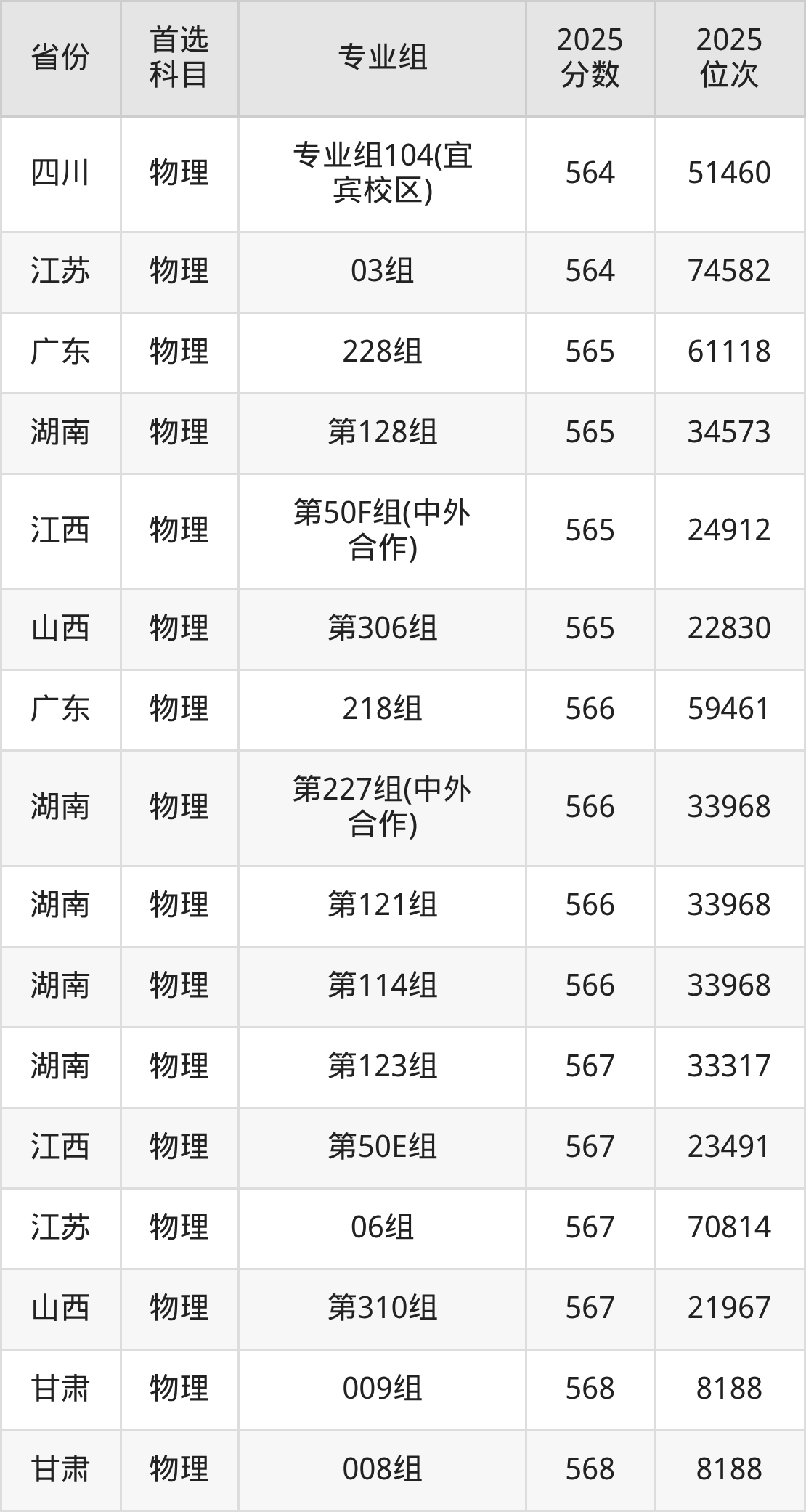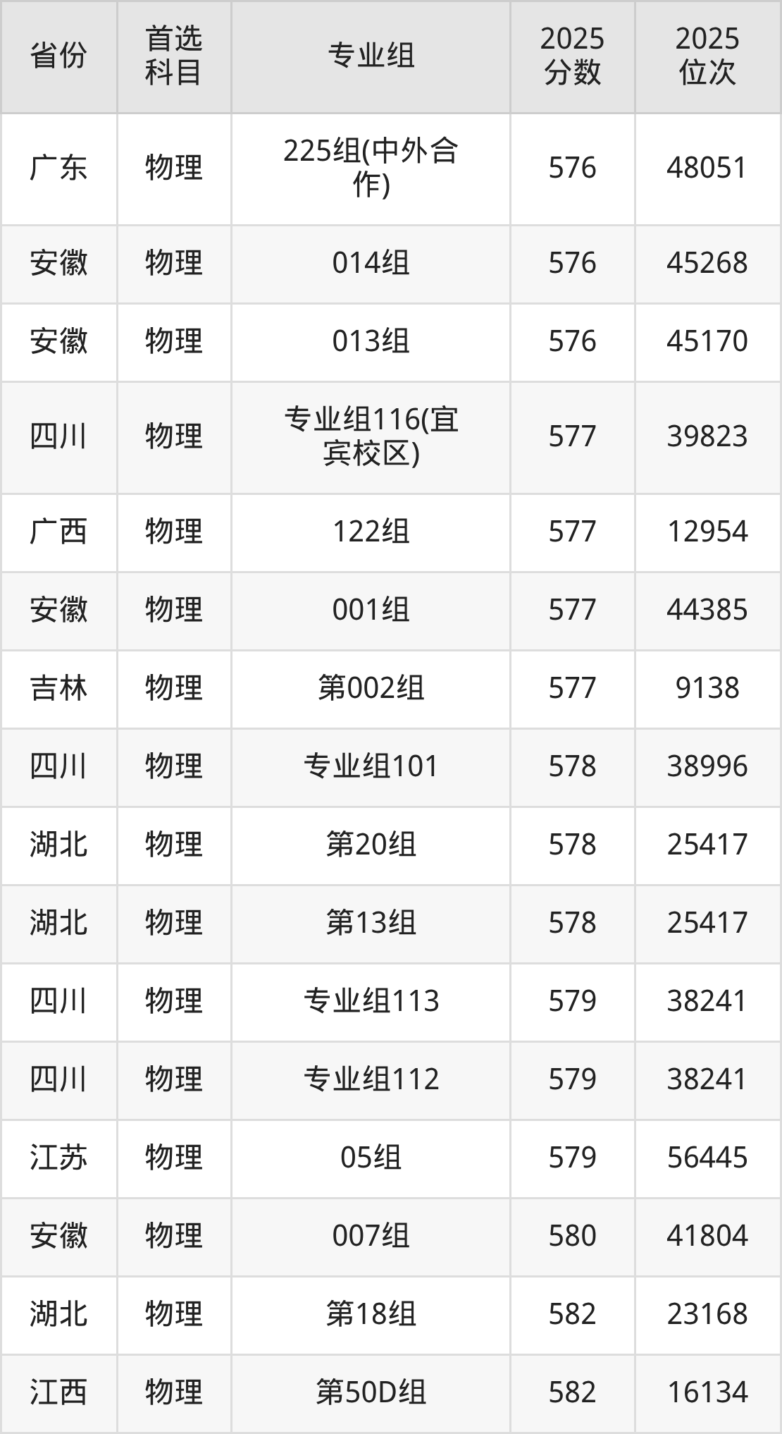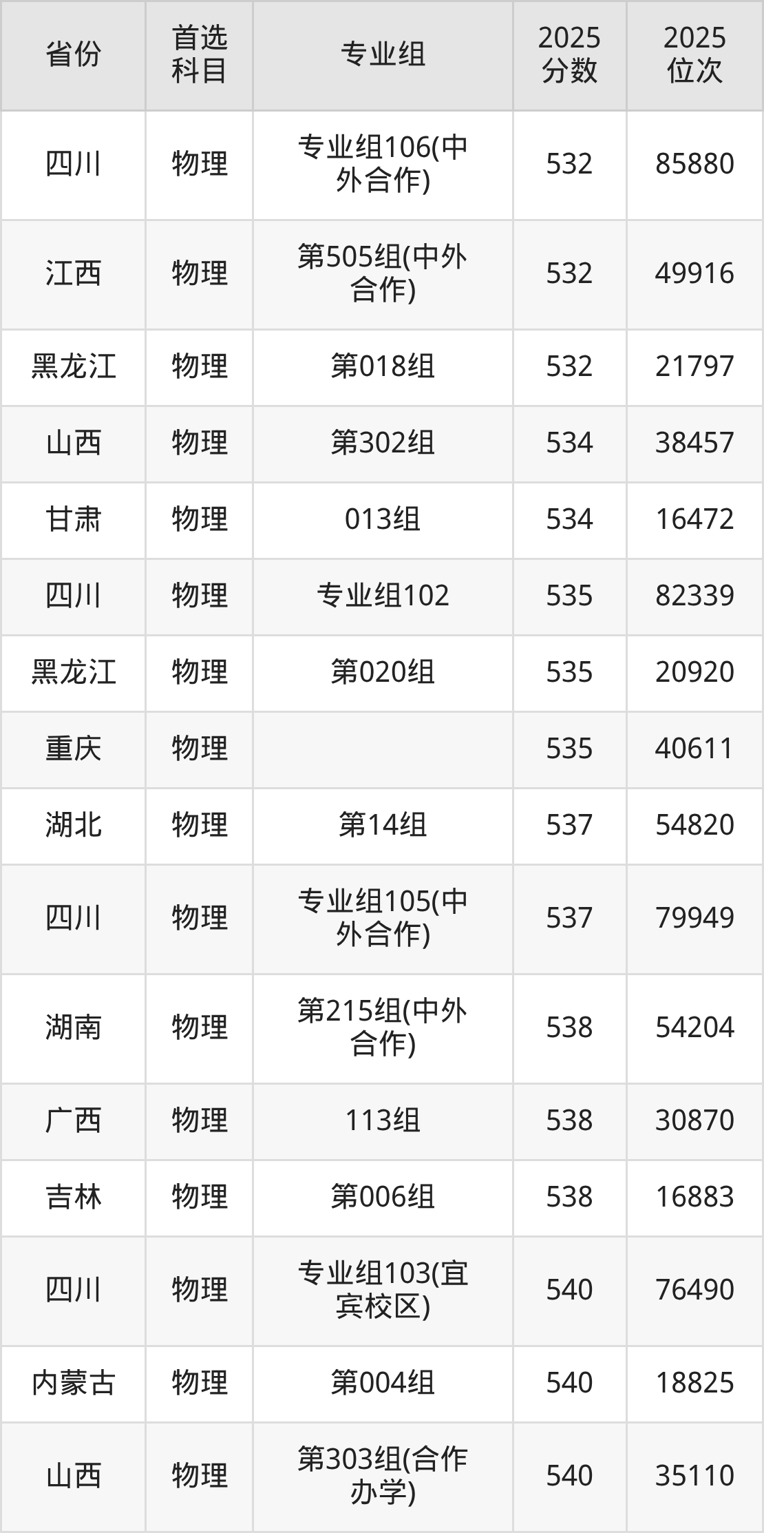 物理类:专业组101578分、38996名,专业组102535分、82339名,专业组103(宜宾校区)540分、76490名,专业组104(宜宾校区)564分、51460名,专业组105(中外合作)537分、79949名,专业组106(中外合作)532分、85880名,专业组107606分、19899名,专业组108598分、24744名,专业组109589分、30818名,专业组110575分、41558名,专业组111592分、28720名,专业组112579分、38241名,专业组113579分、38241名,专业组114585分、33728名,专业组115(宜宾校区)588分、31541名,专业组116(宜宾校区)577分、39823名,专业组117(宜宾校区)570分、45869名,专业组118(中外合作)547分、68733名,专业组119546分、69786名,专业组120576分、40707名,专业组121(宜宾校区)531分、87075名,专业组122(宜宾校区)491分、139538名;