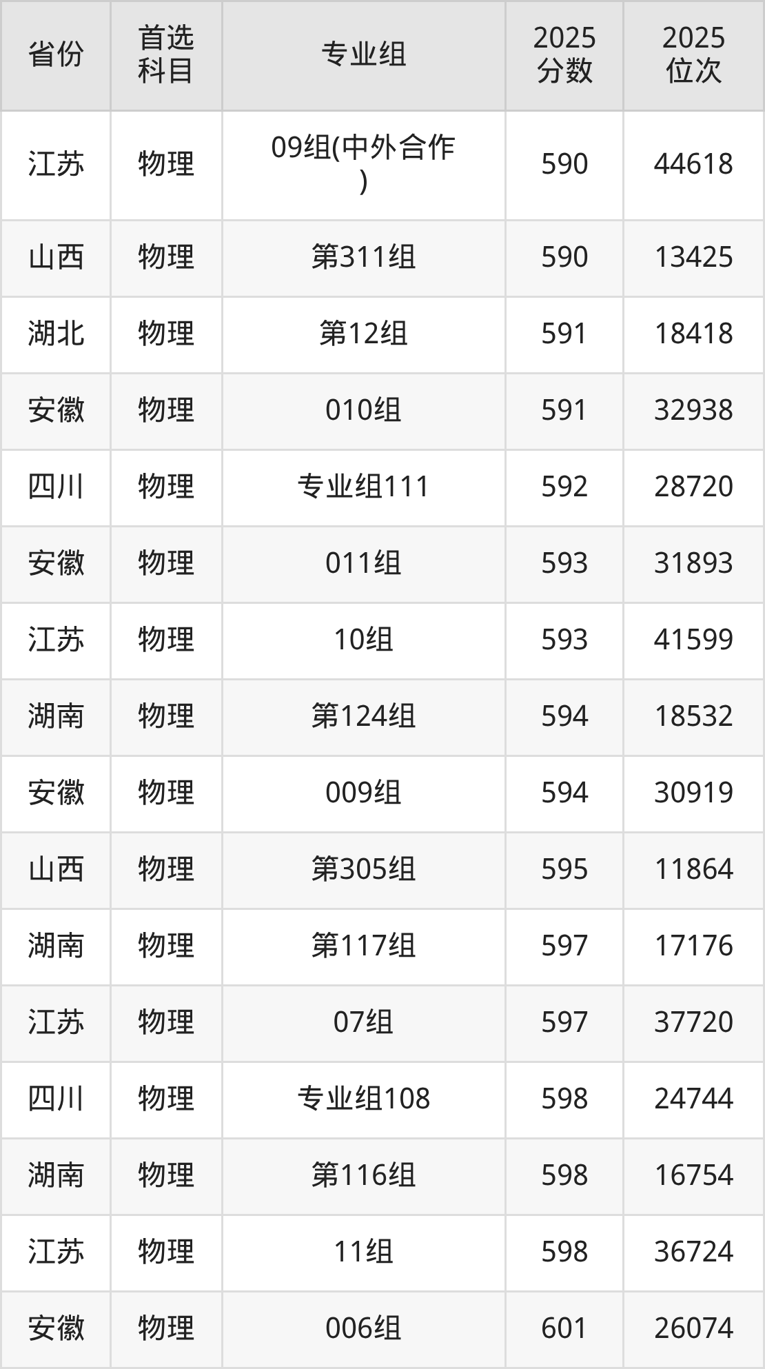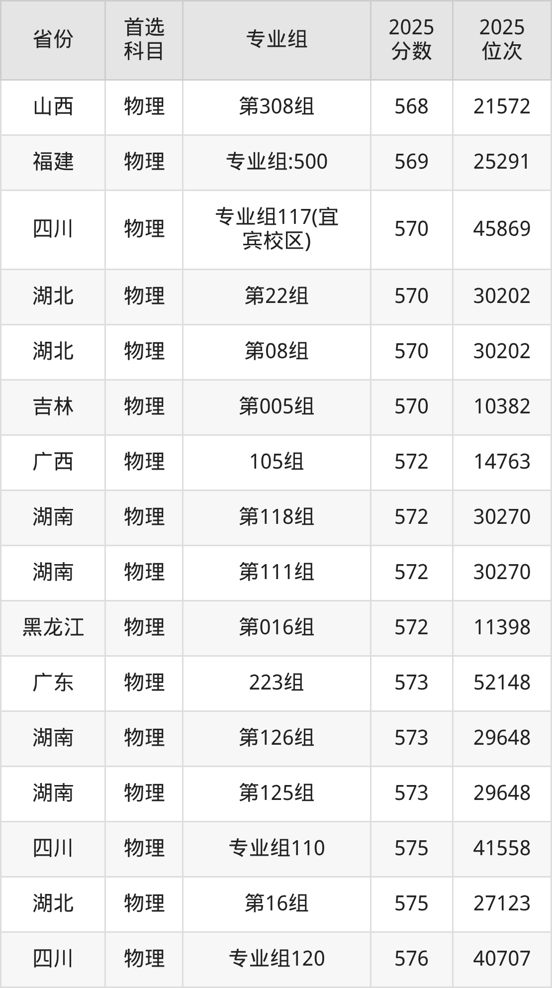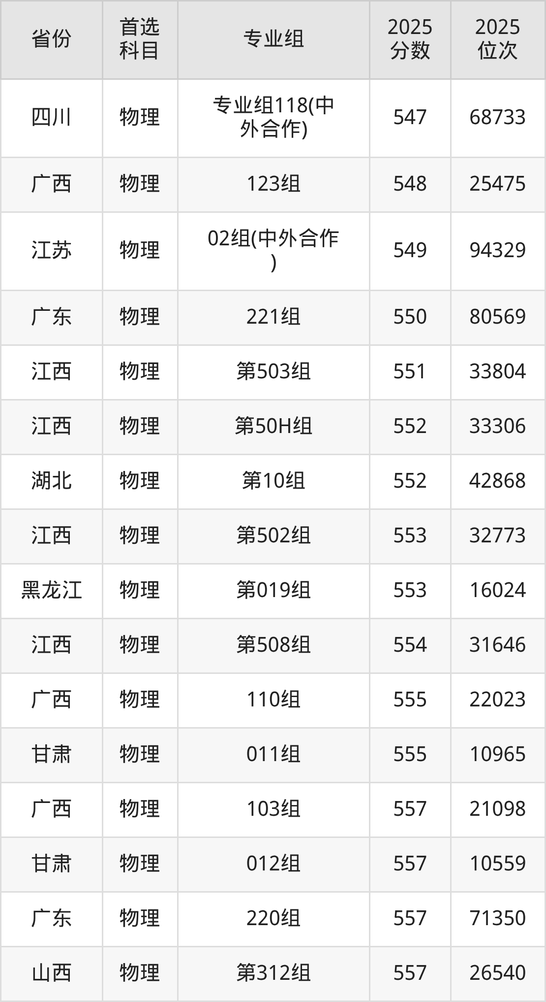 物理类:专业组101578分、38996名,专业组102535分、82339名,专业组103(宜宾校区)540分、76490名,专业组104(宜宾校区)564分、51460名,专业组105(中外合作)537分、79949名,专业组106(中外合作)532分、85880名,专业组107606分、19899名,专业组108598分、24744名,专业组109589分、30818名,专业组110575分、41558名,专业组111592分、28720名,专业组112579分、38241名,专业组113579分、38241名,专业组114585分、33728名,专业组115(宜宾校区)588分、31541名,专业组116(宜宾校区)577分、39823名,专业组117(宜宾校区)570分、45869名,专业组118(中外合作)547分、68733名,专业组119546分、69786名,专业组120576分、40707名,专业组121(宜宾校区)531分、87075名,专业组122(宜宾校区)491分、139538名;