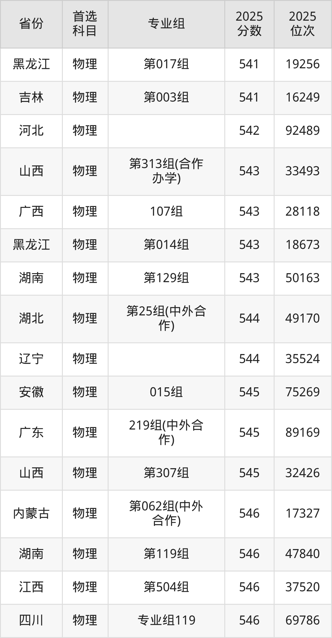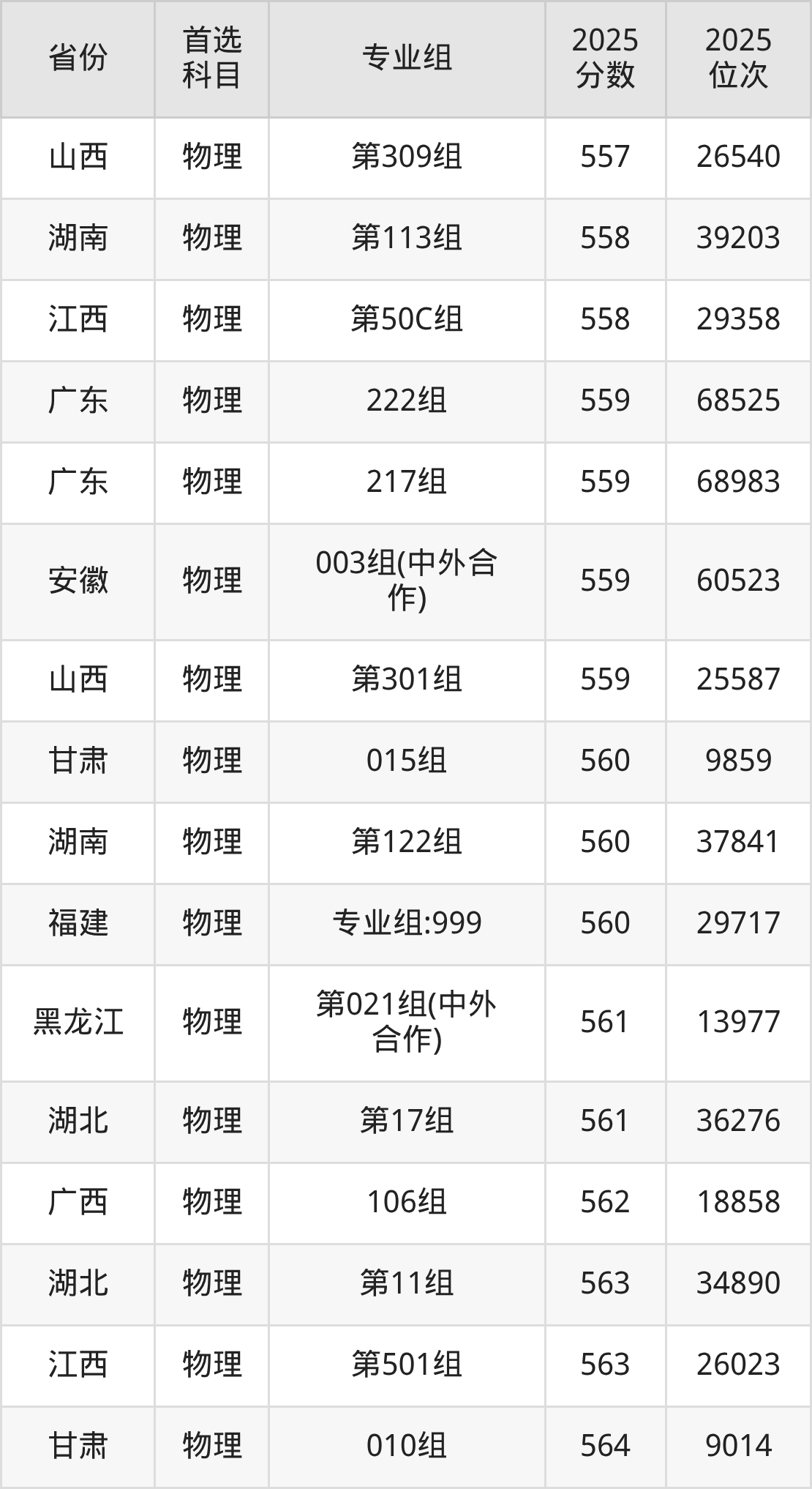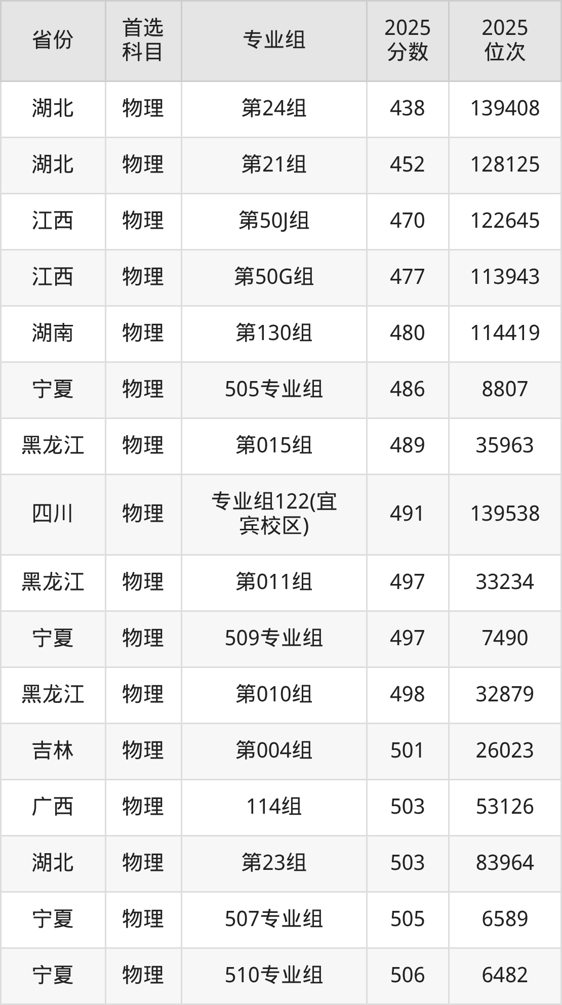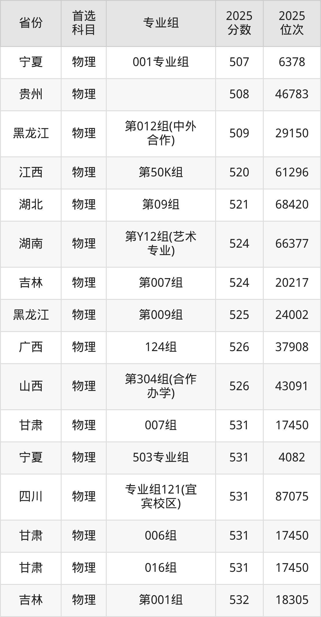 物理类:专业组101578分、38996名,专业组102535分、82339名,专业组103(宜宾校区)540分、76490名,专业组104(宜宾校区)564分、51460名,专业组105(中外合作)537分、79949名,专业组106(中外合作)532分、85880名,专业组107606分、19899名,专业组108598分、24744名,专业组109589分、30818名,专业组110575分、41558名,专业组111592分、28720名,专业组112579分、38241名,专业组113579分、38241名,专业组114585分、33728名,专业组115(宜宾校区)588分、31541名,专业组116(宜宾校区)577分、39823名,专业组117(宜宾校区)570分、45869名,专业组118(中外合作)547分、68733名,专业组119546分、69786名,专业组120576分、40707名,专业组121(宜宾校区)531分、87075名,专业组122(宜宾校区)491分、139538名;