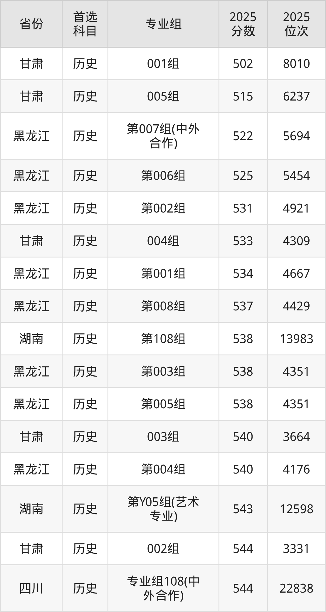 历史类最低分对应地区为甘肃(001组),录取位次为8010;最高分对应地区为四川(专业组109),录取位次为7556,超本科B119分。