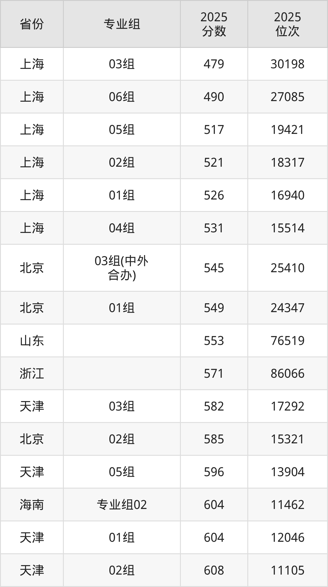 最低分对应地区为上海(03组),录取位次为30198,超本科线77分;最高分对应地区为海南(专业组01),录取位次为8546,超本科线142分。