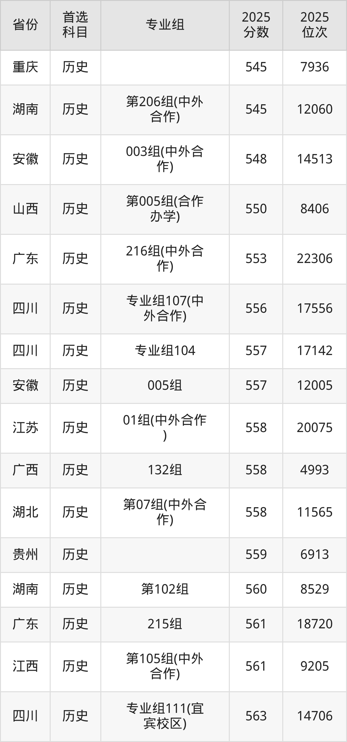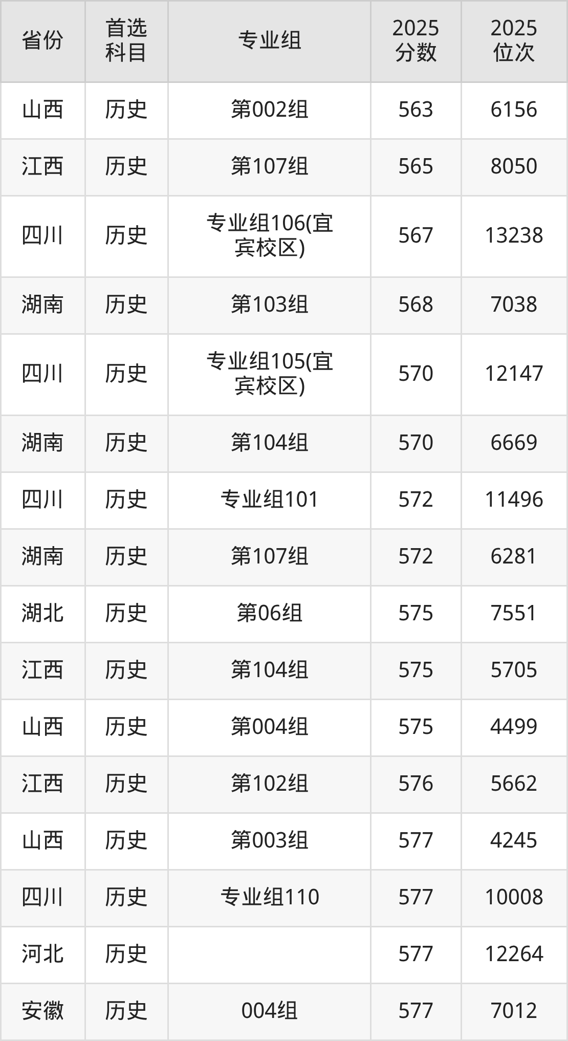 历史类:专业组101572分、11496名,专业组102578分、9693名,专业组103579分、9420名,专业组104557分、17142名,专业组105(宜宾校区)570分、12147名,专业组106(宜宾校区)567分、13238名,专业组107(中外合作)556分、17556名,专业组108(中外合作)544分、22838名,专业组109586分、7556名,专业组110577分、10008名,专业组111(宜宾校区)563分、14706名;