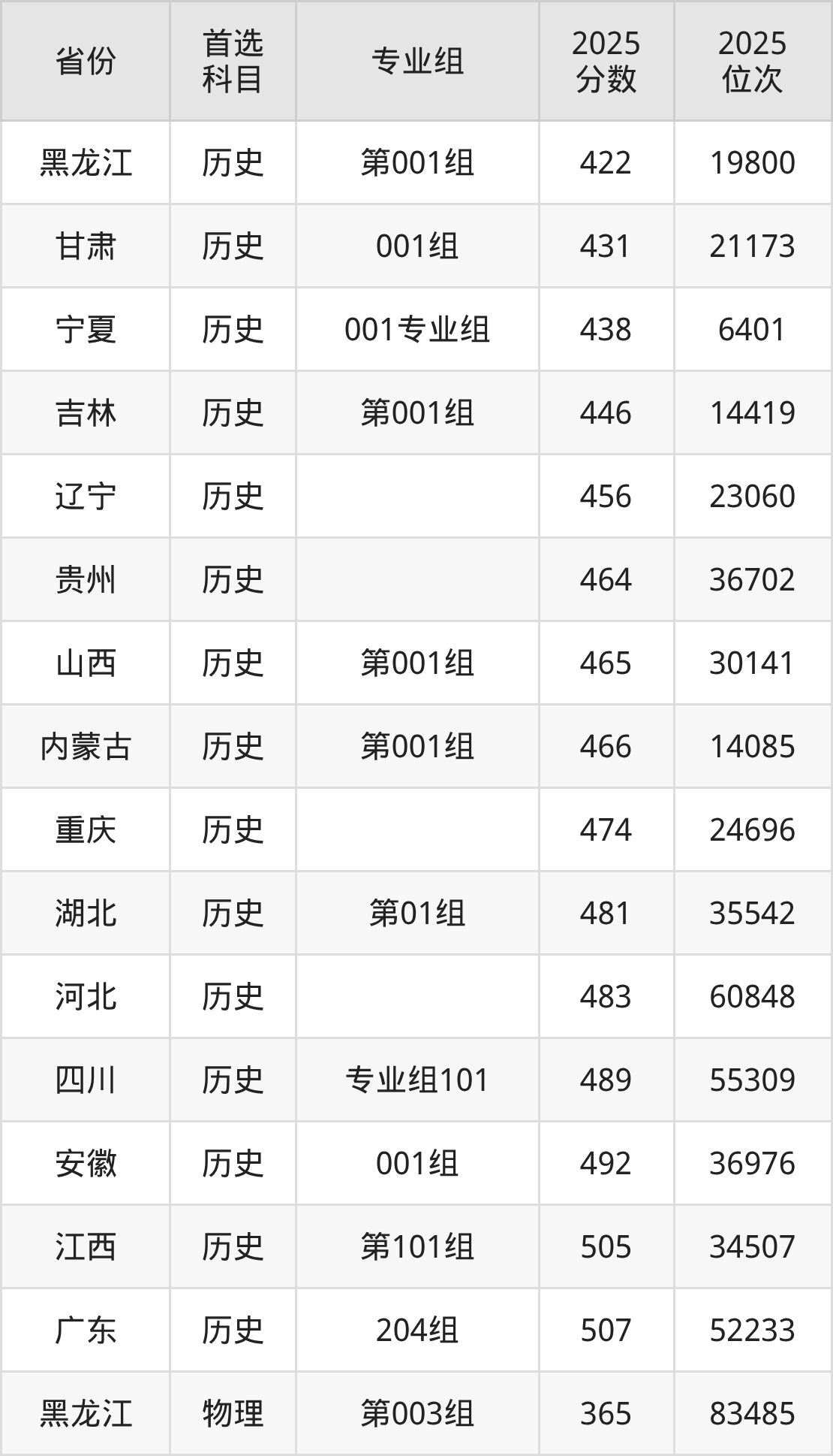 历史类最低分对应地区为黑龙江(第001组),录取位次为19800,超本科线17分;最高分对应地区为广东(204组),录取位次为52233,超本科线43分。