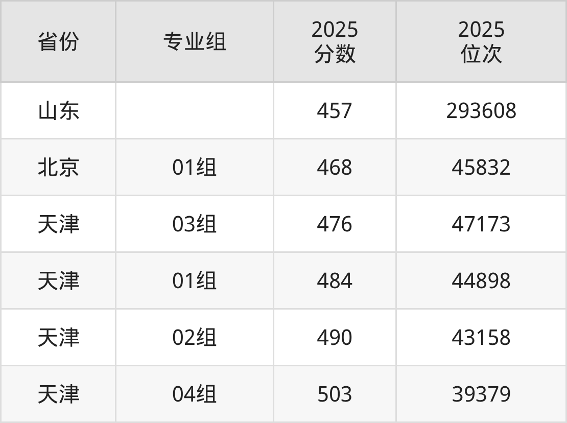 最低分对应地区为山东,录取位次为293608,超一段线51分;最高分对应地区为天津(04组),录取位次为39379,超本科线27分。