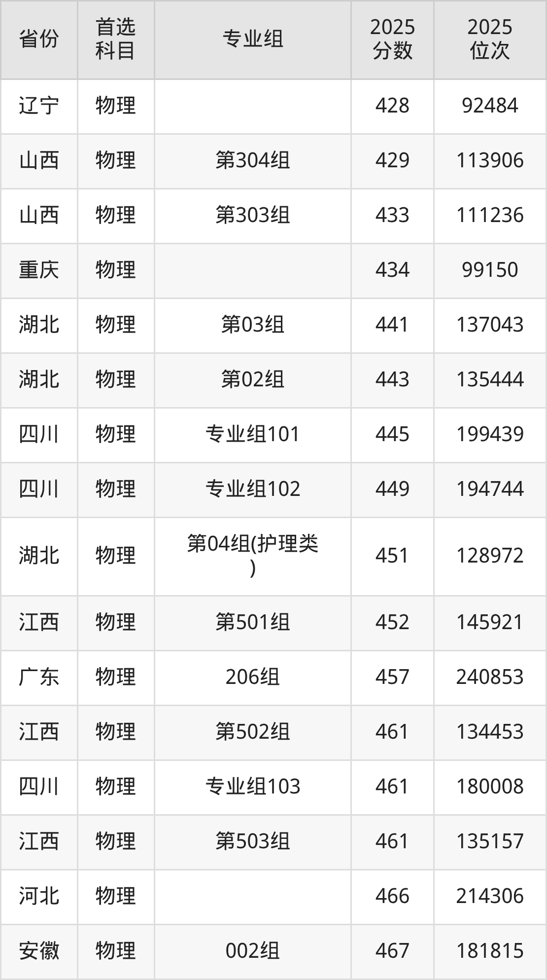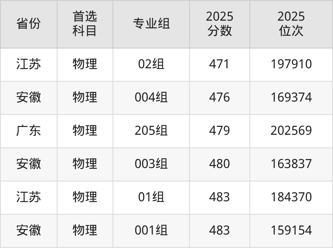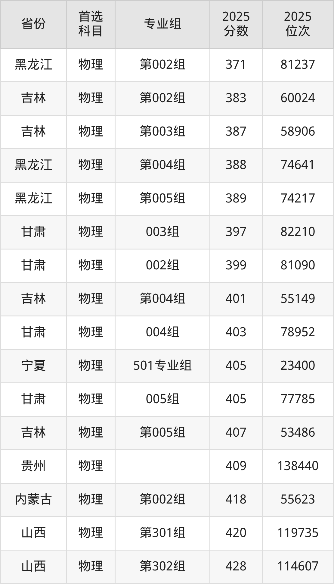 物理类最低分对应地区为黑龙江(第003组),录取位次为83485,超本科线5分;最高分对应地区为安徽(001组),录取位次为159154,超本科线22分。