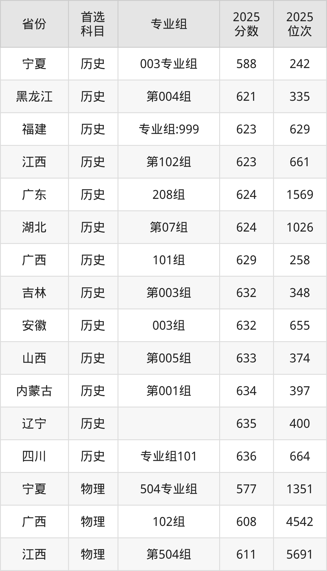 历史类最低分对应地区为宁夏(003专业组),录取位次为242,超本科B184分;最高分对应地区为四川(专业组101),录取位次为664,超本科B169分。