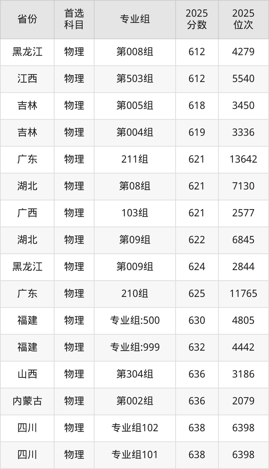 物理类:104组(国家免费师范生)633分、9274名,106组(国家免费师范生)630分、10462名,202组630分、10462名,203组627分、11762名。