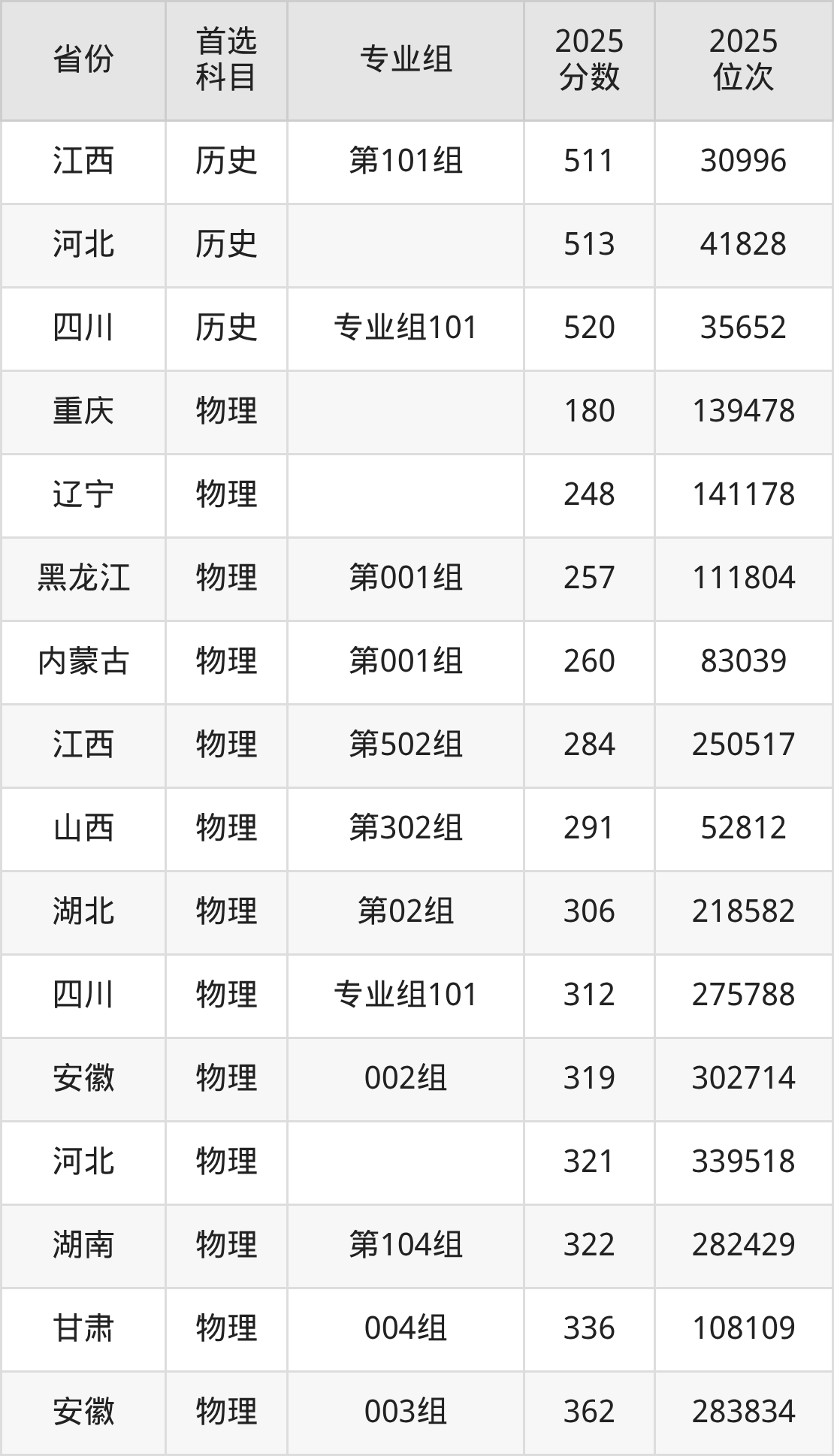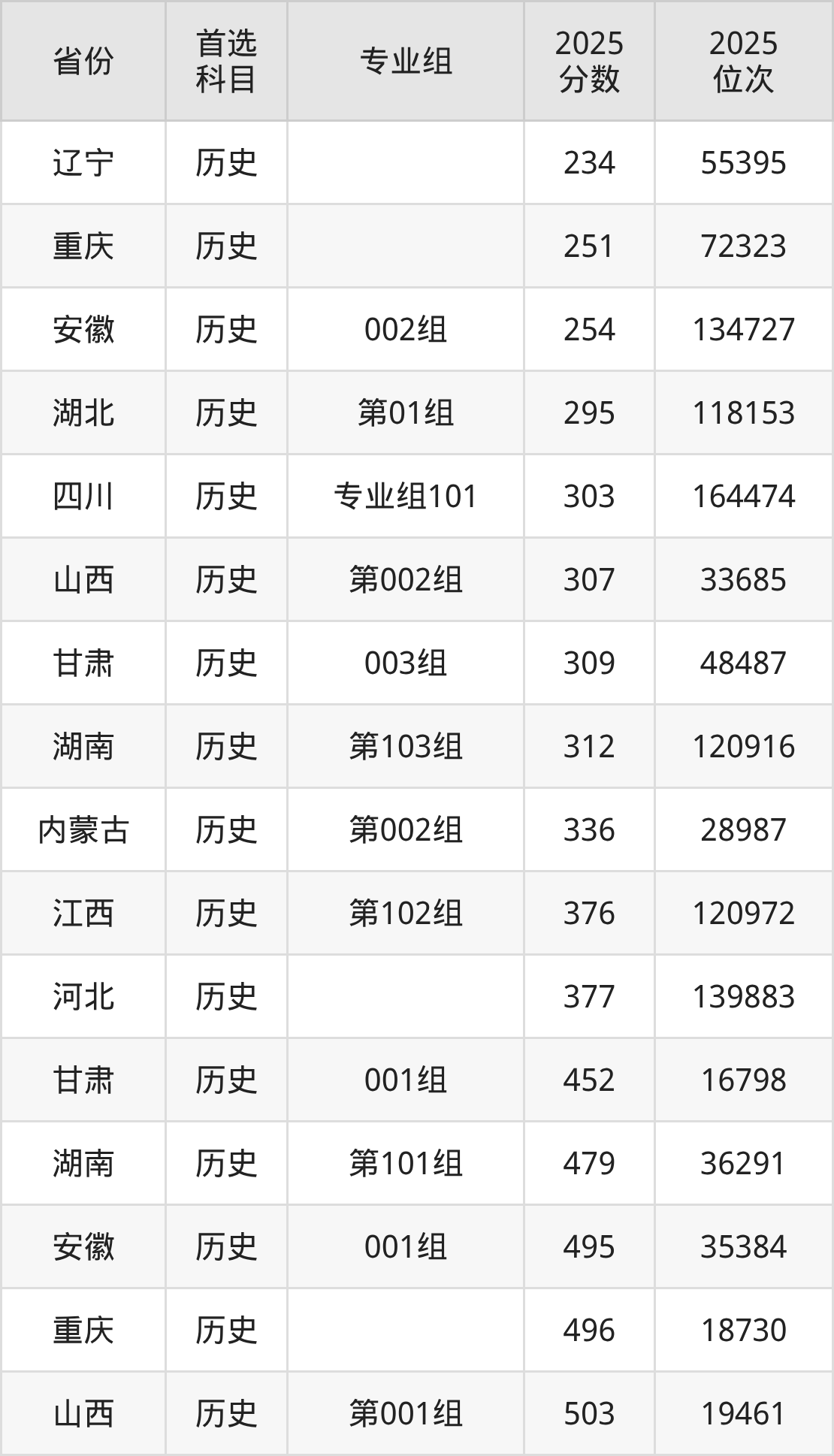 历史类最低分对应地区为辽宁,录取位次为55395,超专科线84分;最高分对应地区为四川(专业组101),录取位次为35652,超本科B53分。