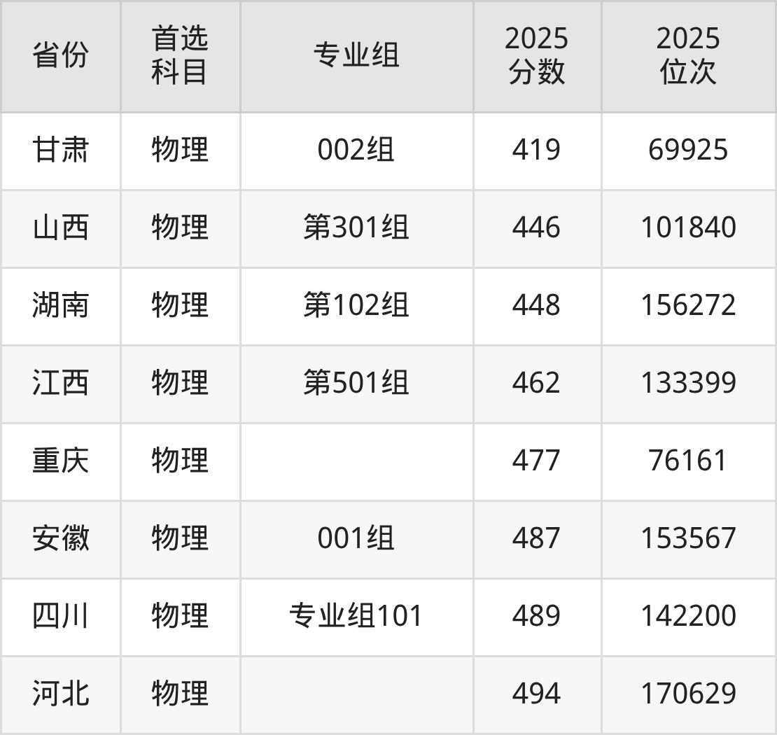物理类最低分对应地区为重庆,录取位次为139478;最高分对应地区为河北,录取位次为170629,超本科线35分。