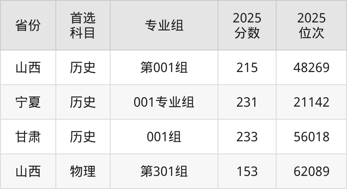 历史类最低分对应地区为山西(第001组),录取位次为48269,超专科线115分;最高分对应地区为甘肃(001组),录取位次为56018,超专科线73分。