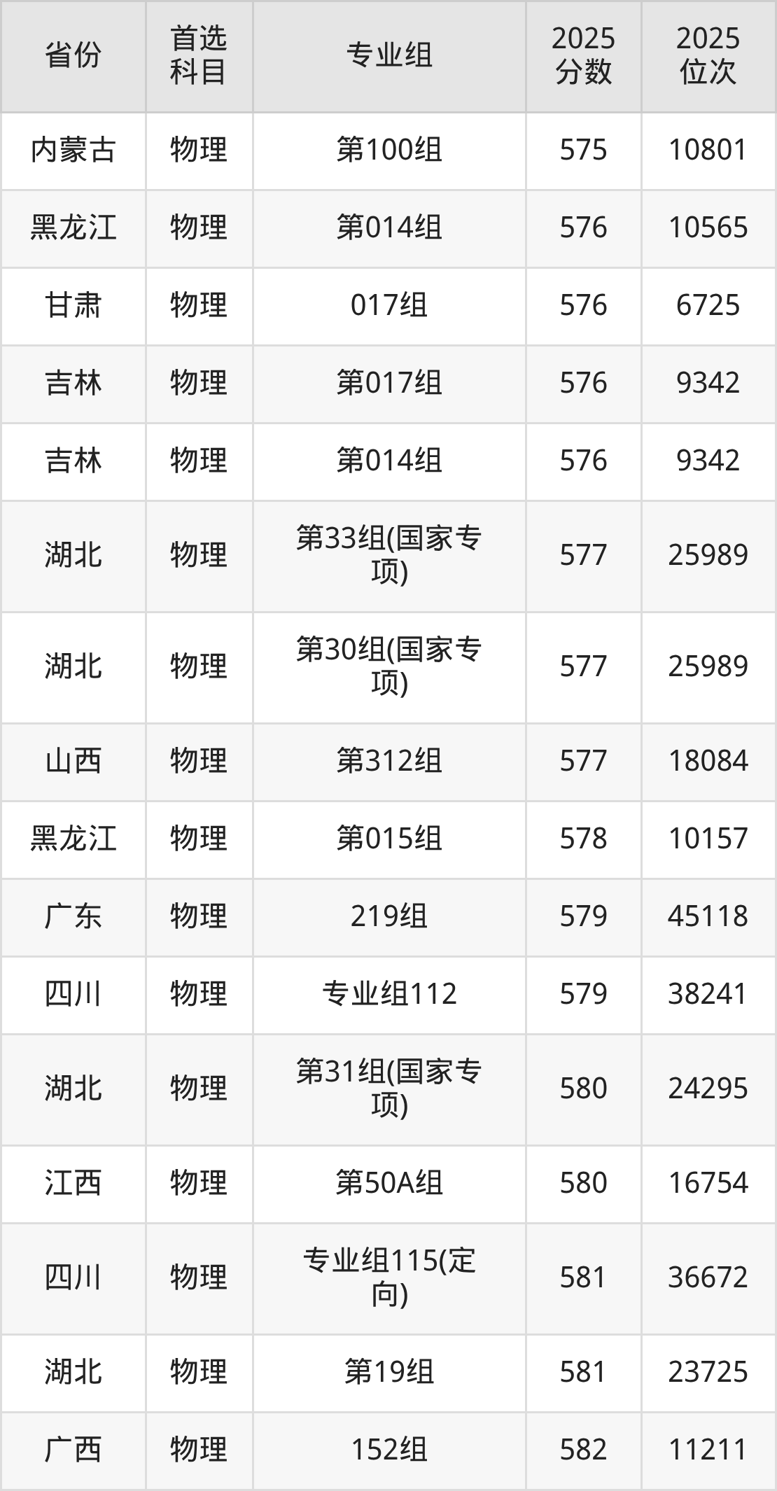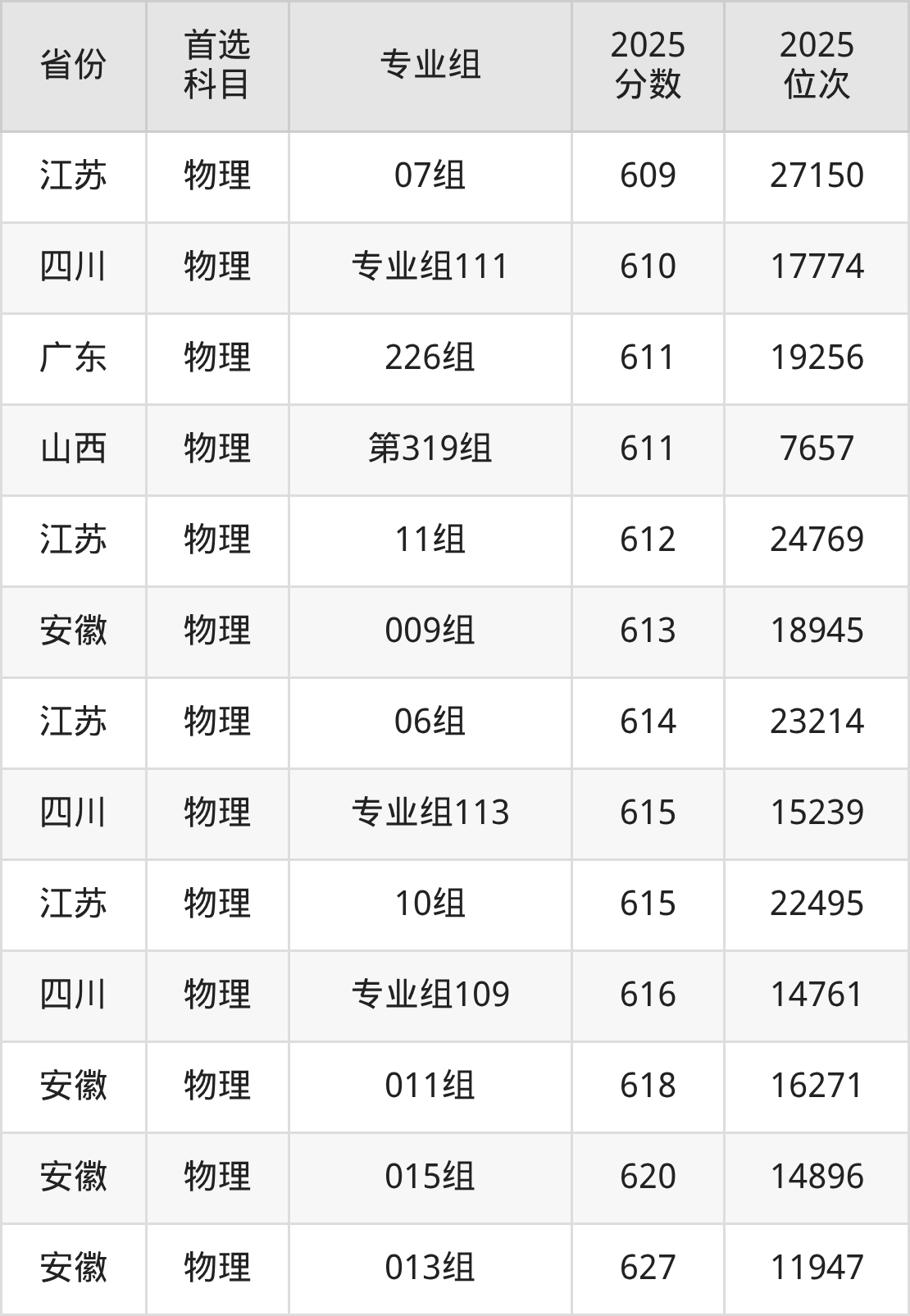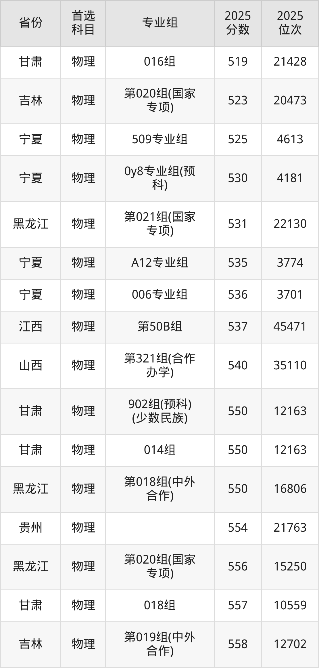 物理类最低分对应地区为宁夏(6A3专业组(国家专项)),录取位次为21343,超本科B43分;最高分对应地区为安徽(013组),录取位次为11947,超本科线166分。